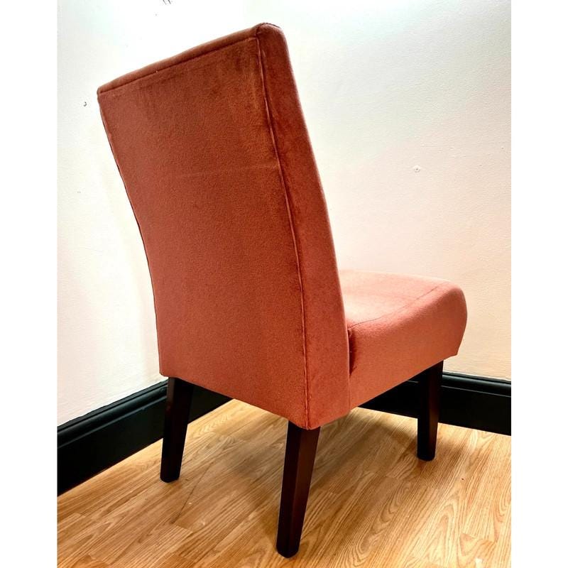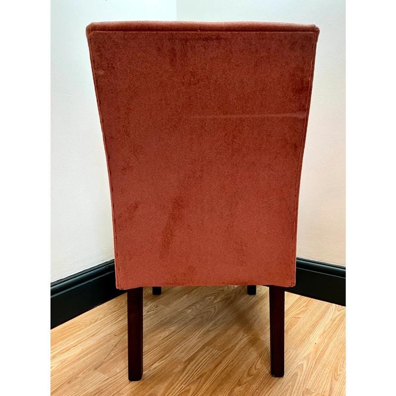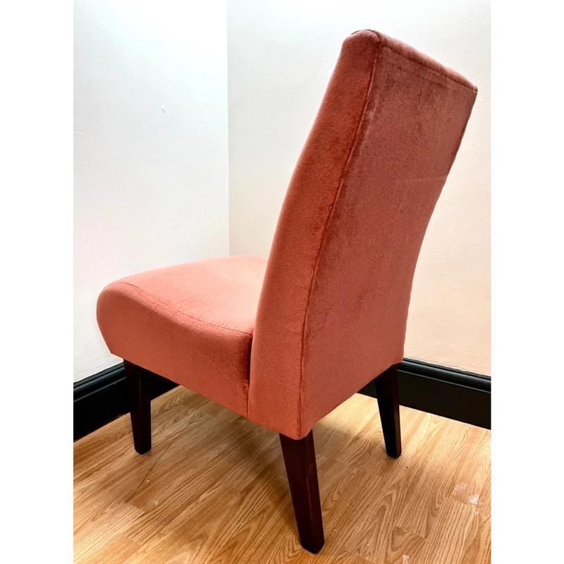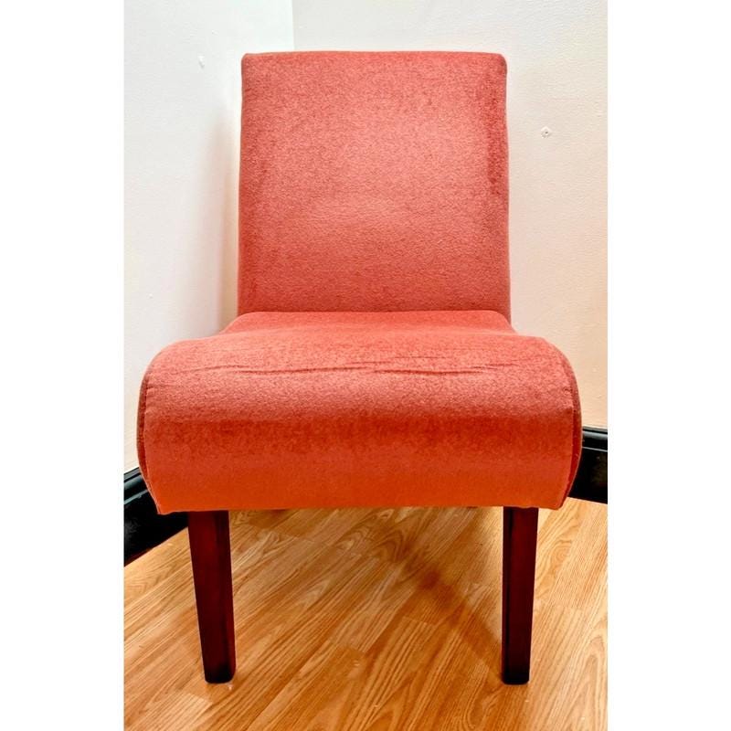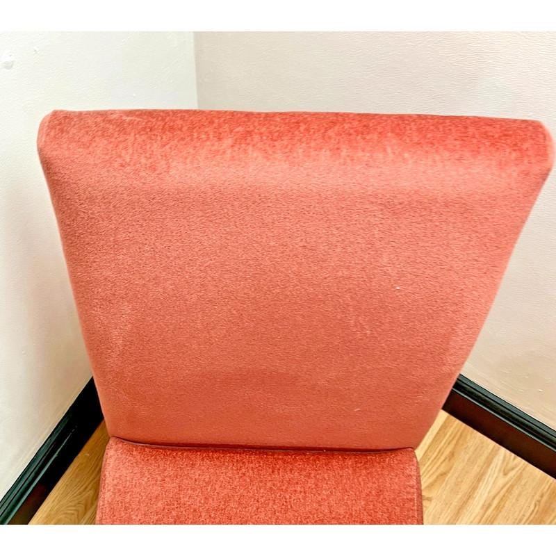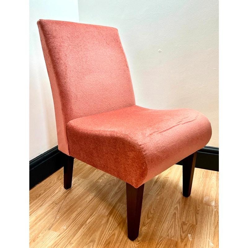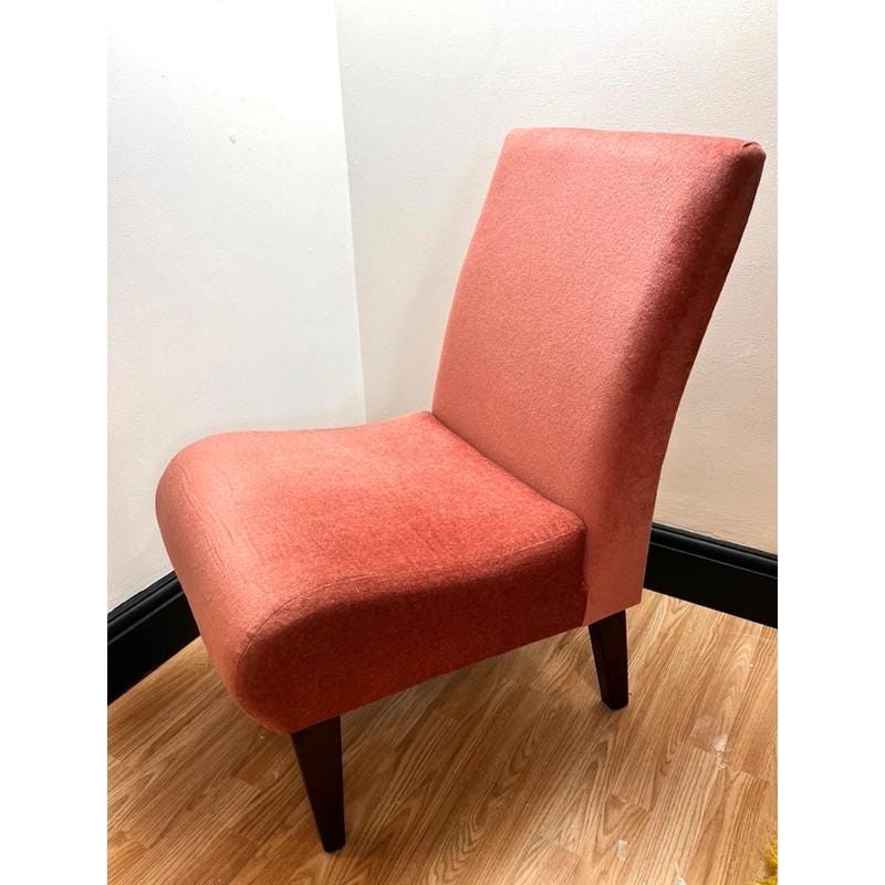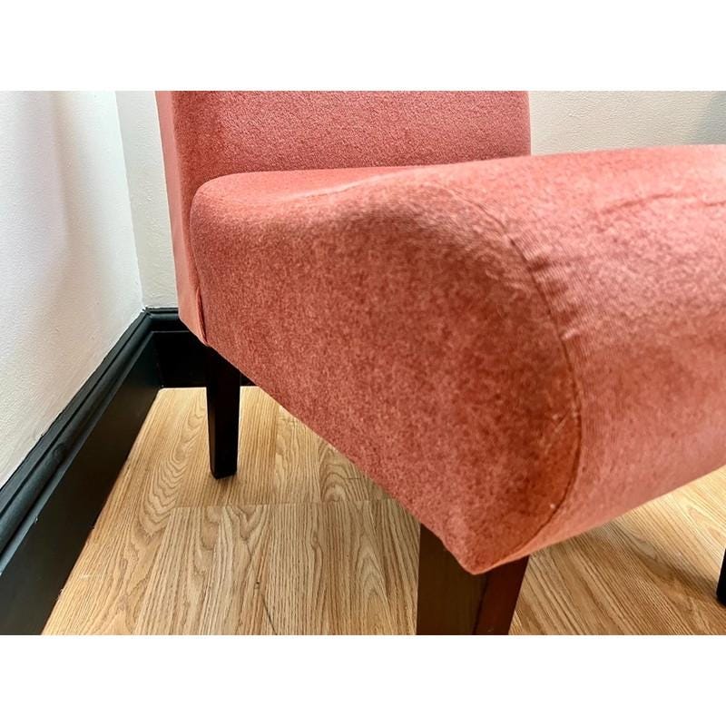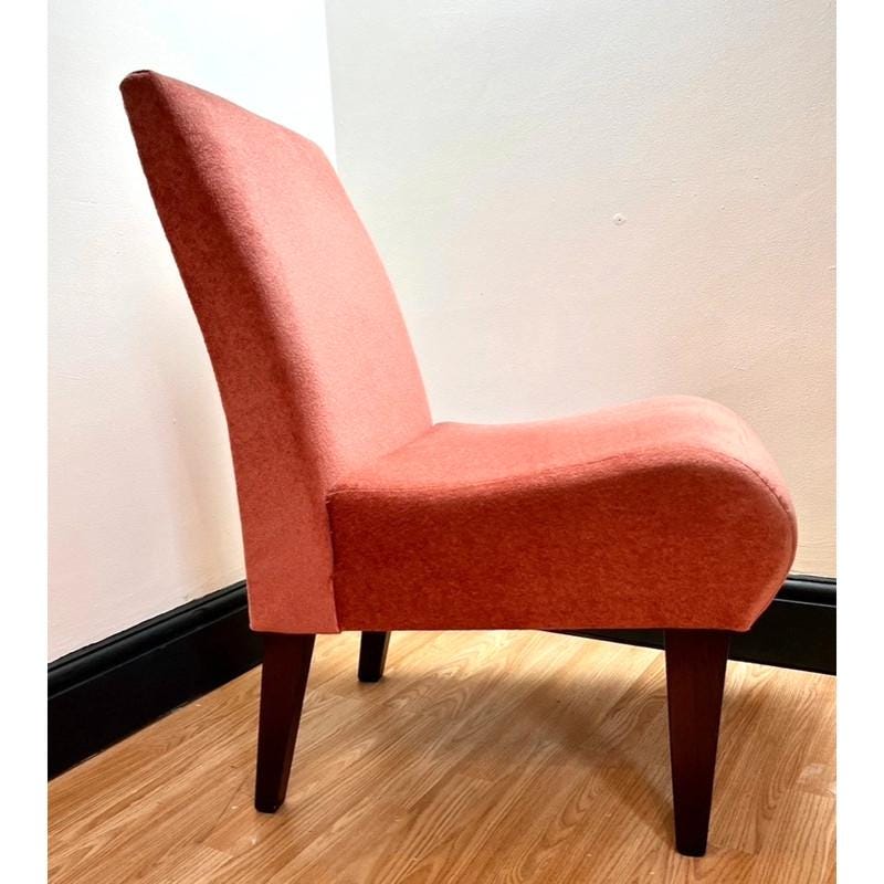 A stylish vintage slipper chair with a mid-century inspired design. Upholstered in a rich coral pink fabric, this compact chair sits on tapered dark wooden legs and makes a perfect accent chair for any living room, bedroom, or hallway.