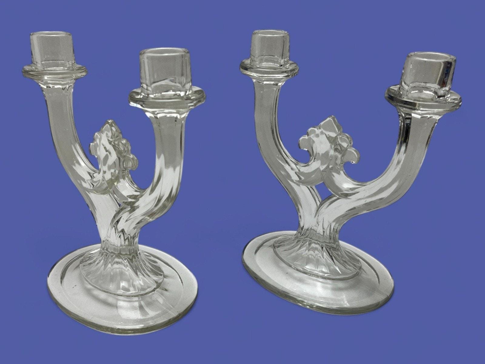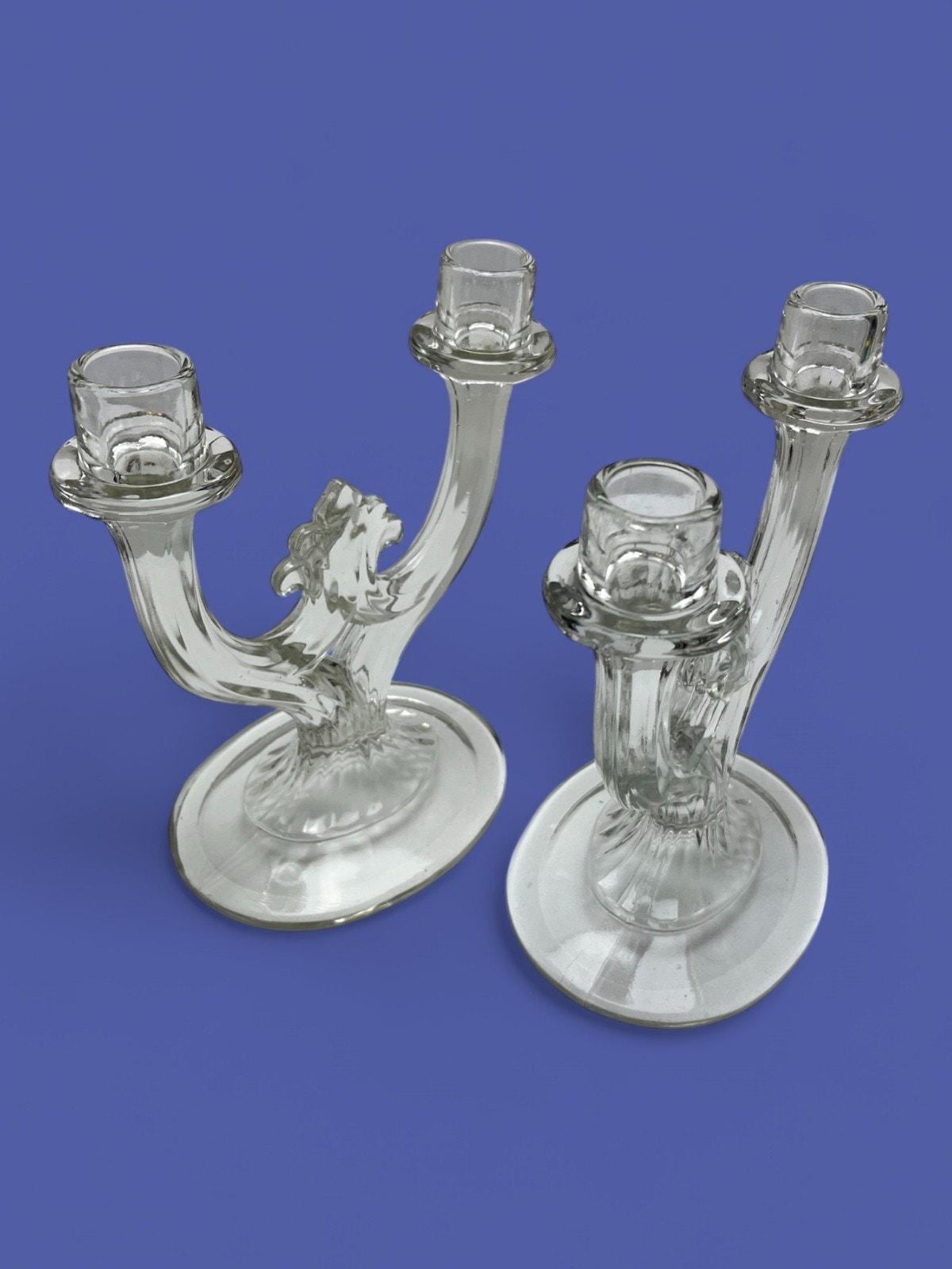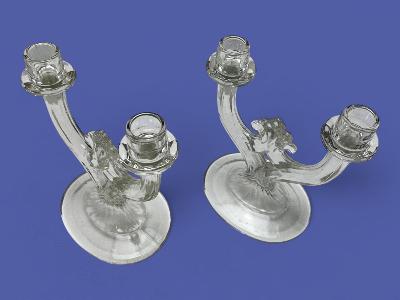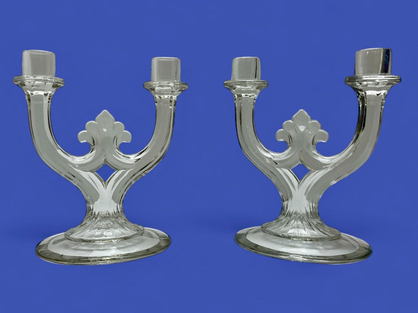 A beautiful pair of Art Deco pressed glass candlesticks, dating from the early to mid-20th century. Each features an elegant double-arm design with a central decorative motif and sturdy round base. The clear pressed glass catches the light beautifully, making them ideal for display as well as use.
