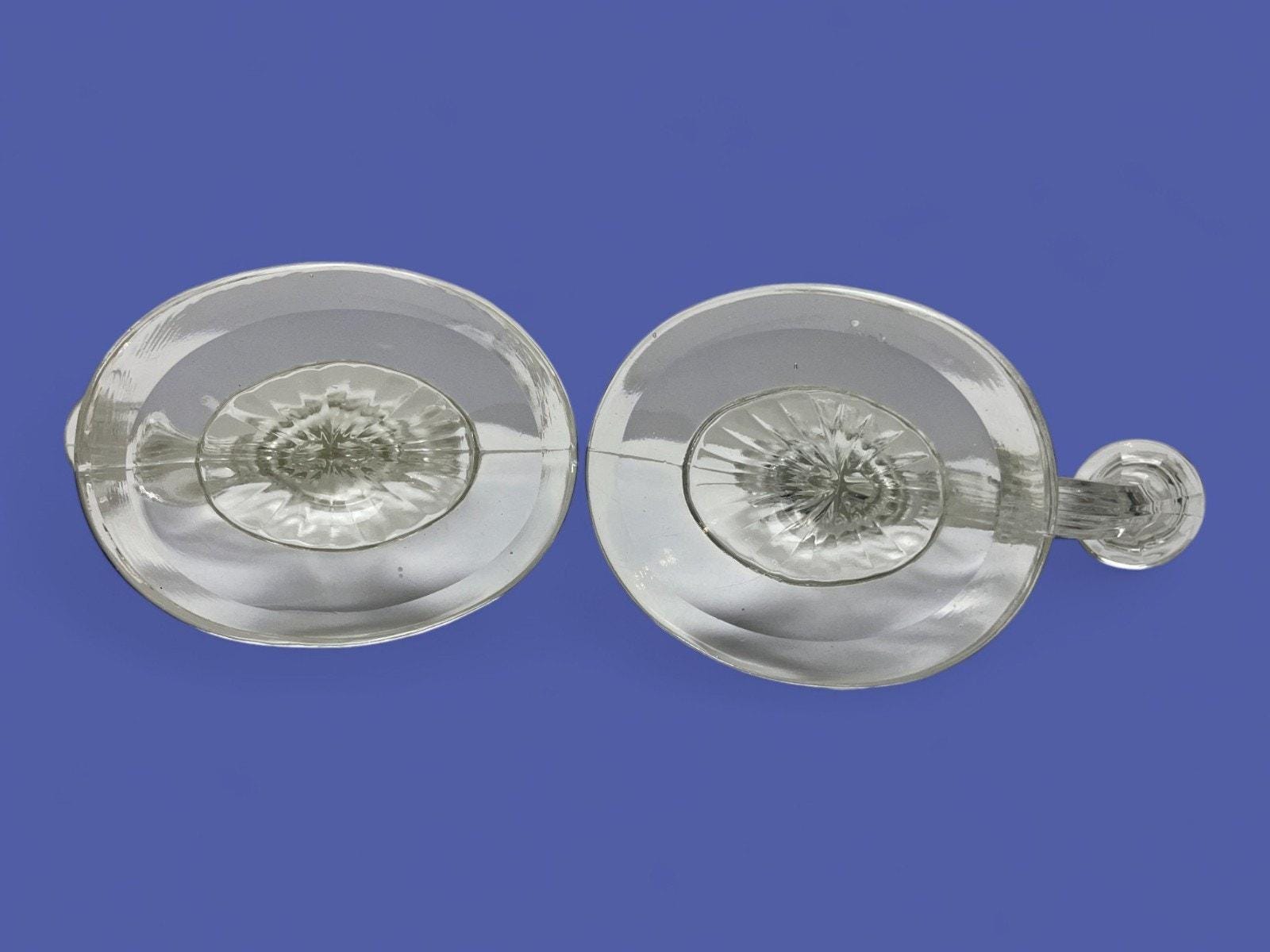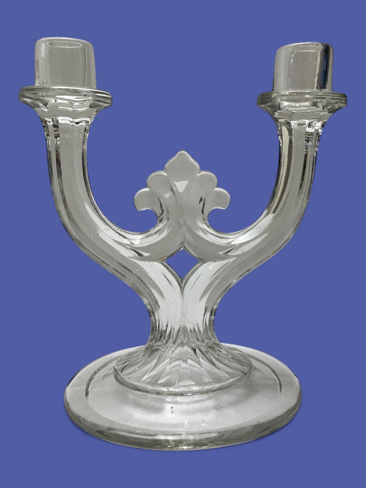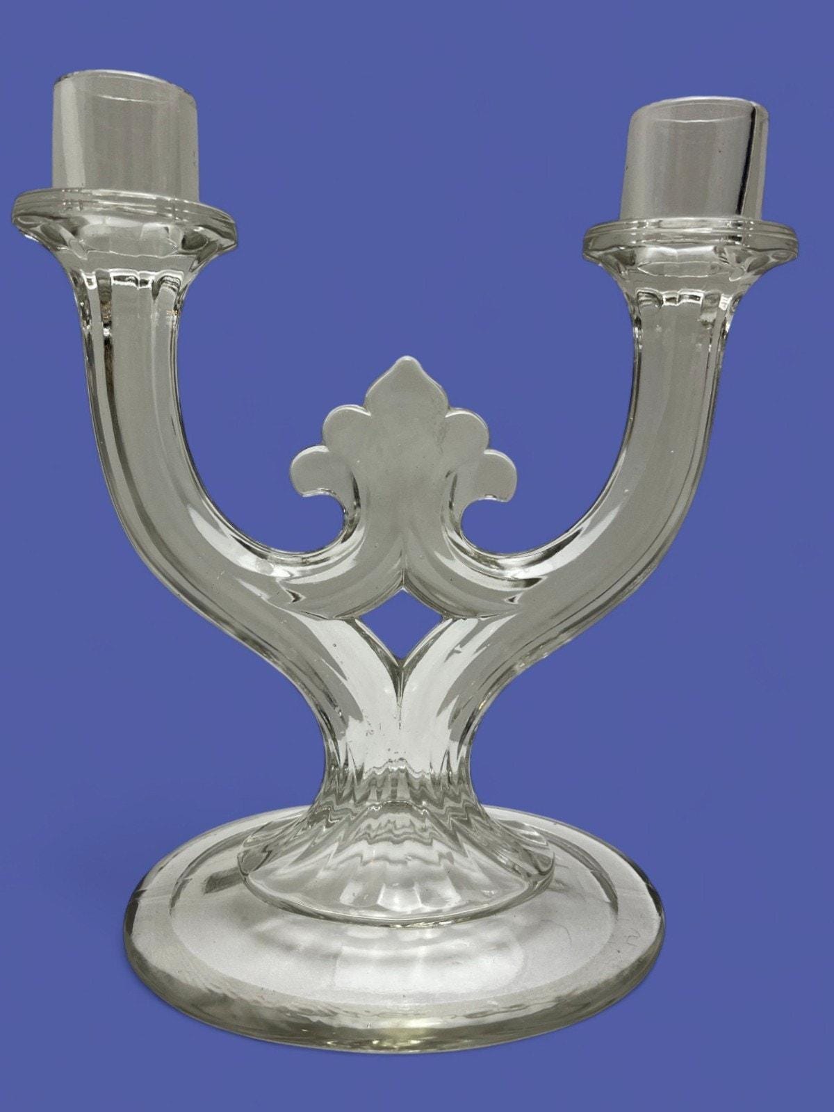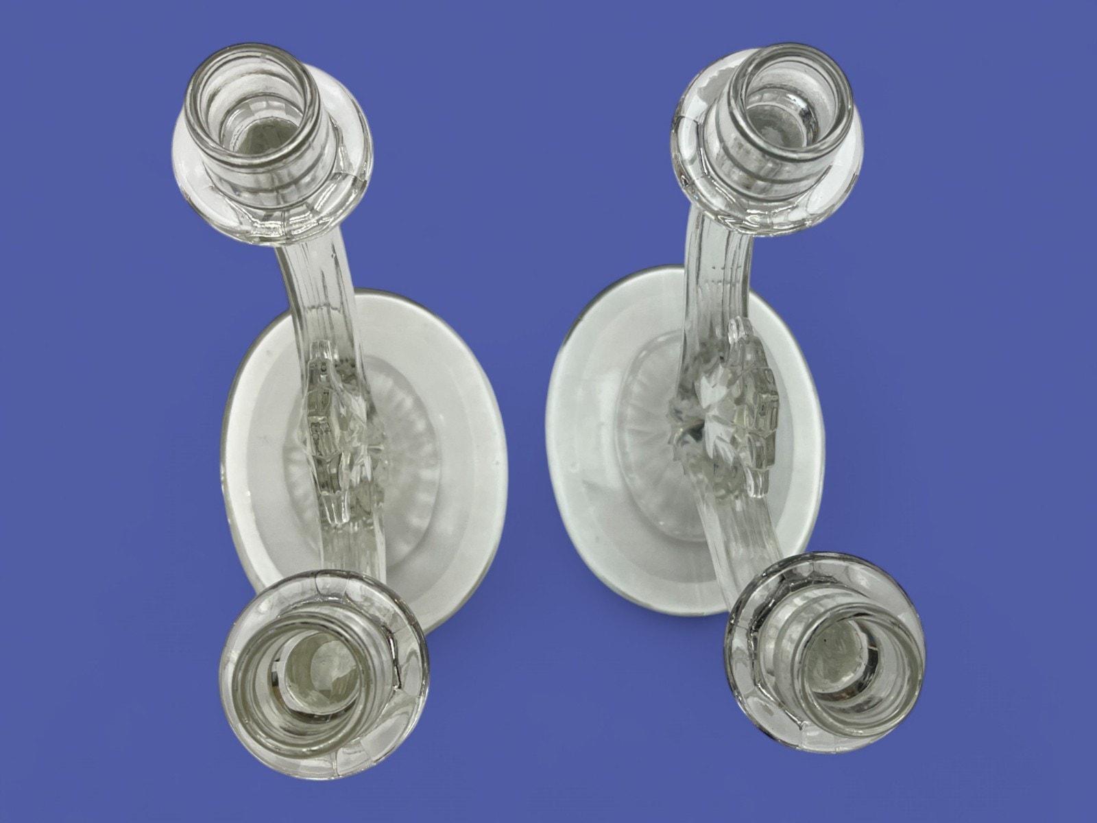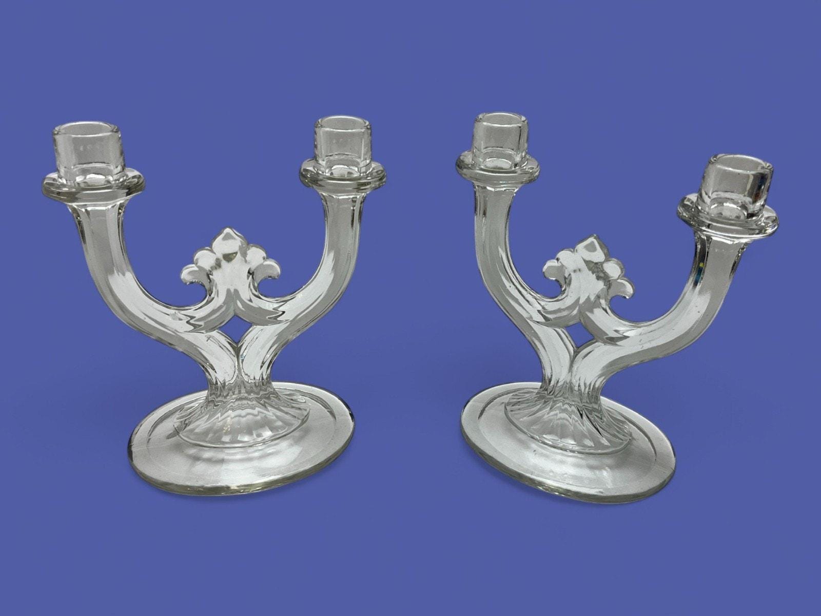A beautiful pair of Art Deco pressed glass candlesticks, dating from the early to mid-20th century. Each features an elegant double-arm design with a central decorative motif and sturdy round base. The clear pressed glass catches the light beautifully, making them ideal for display as well as use.