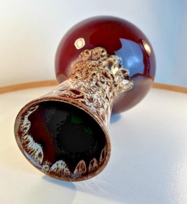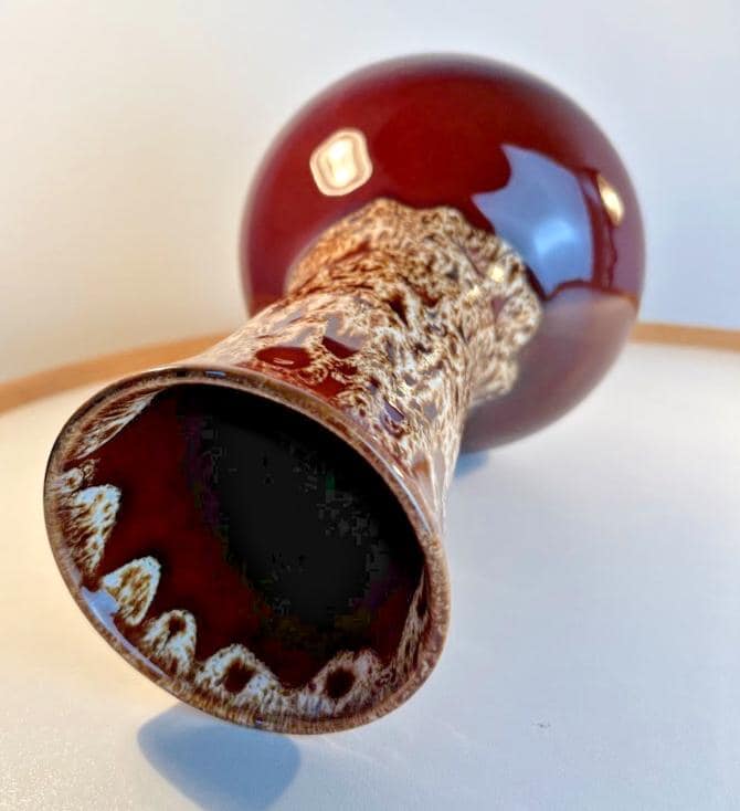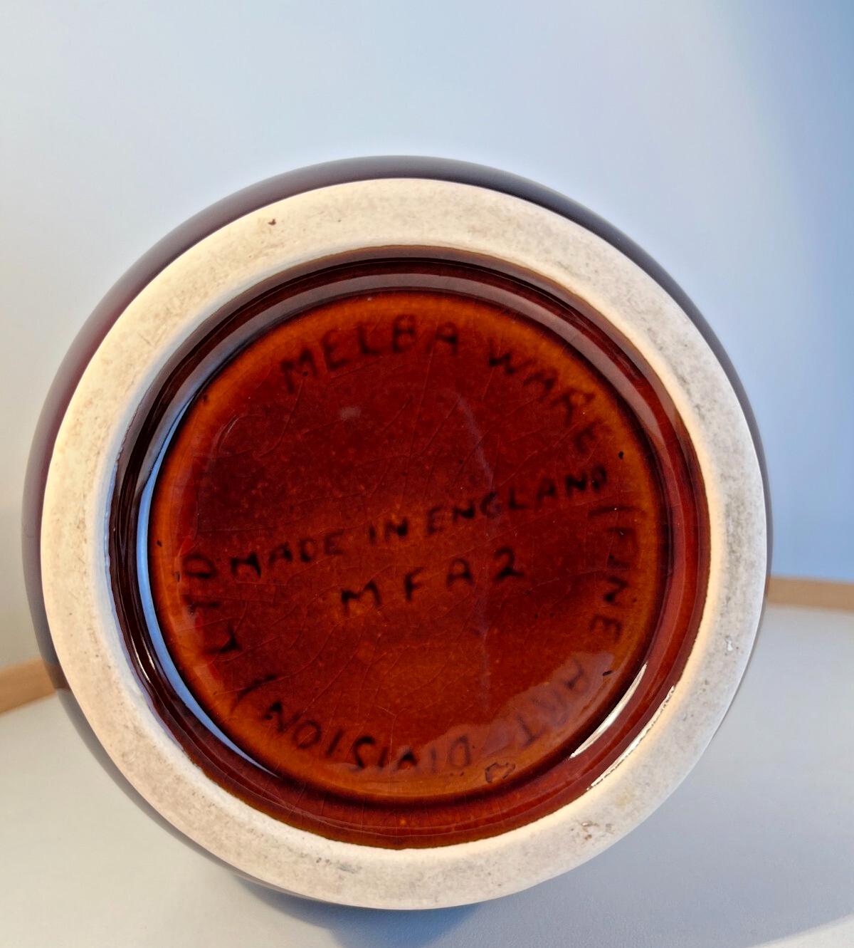 A mid century Melba Ware drip glaze pottery vase for flowers in brown and beige. This nice looking vase is a staple of the 1970s home and still in keeping with its timeless design and shape.