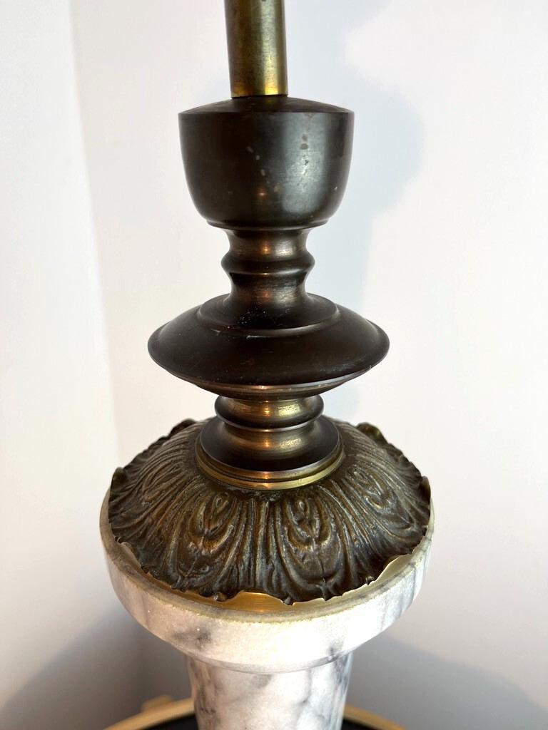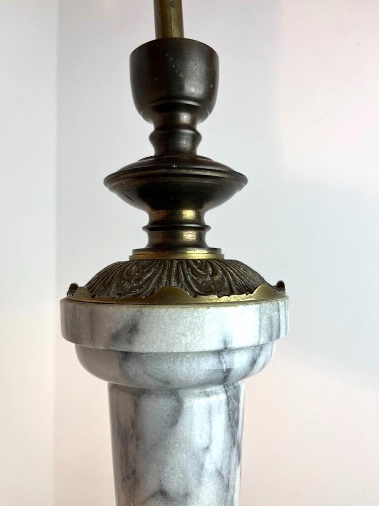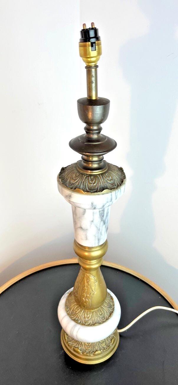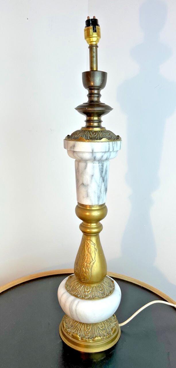 This is a striking mid‑century (circa 1950s) Regency‑style table lamp, combining solid gray and white marble and antique brass. It’s a bold, heavy design piece (6.5 kg), perfect for someone who wants a statement lamp with vintage character—and is comfortable doing a bit of basic restoration.