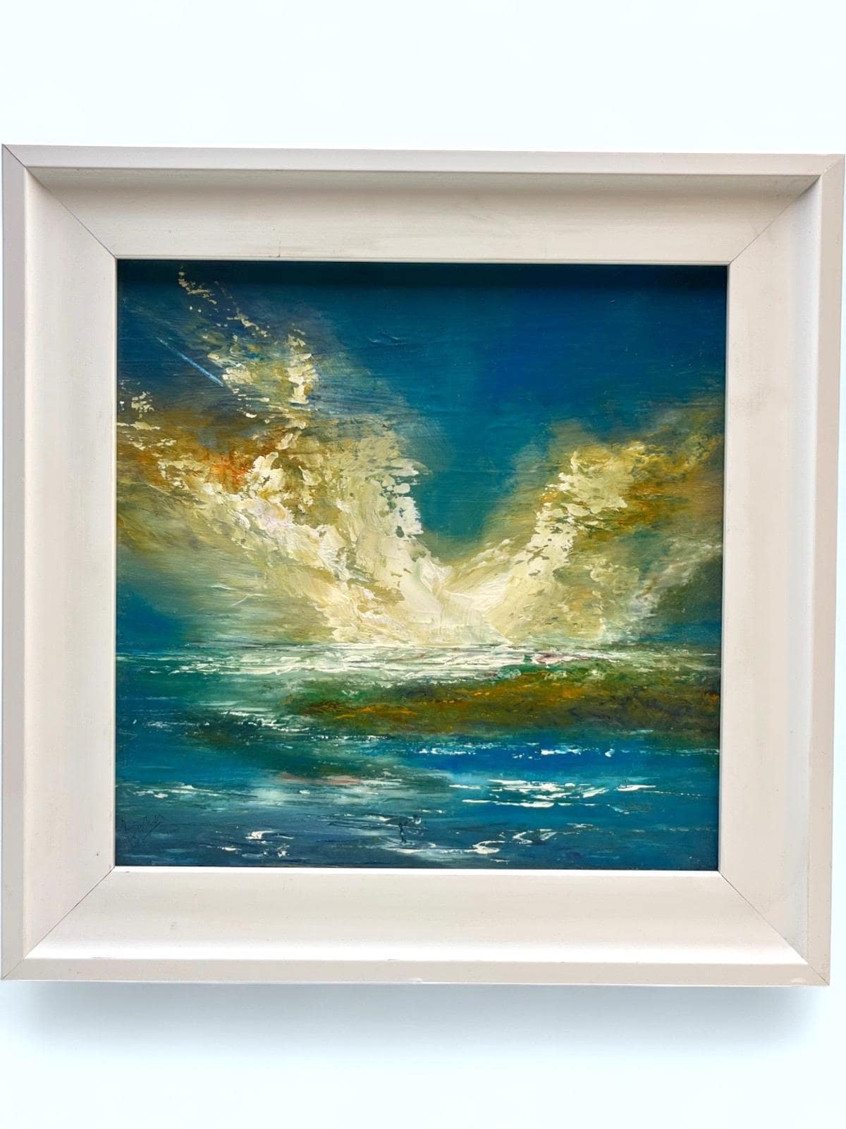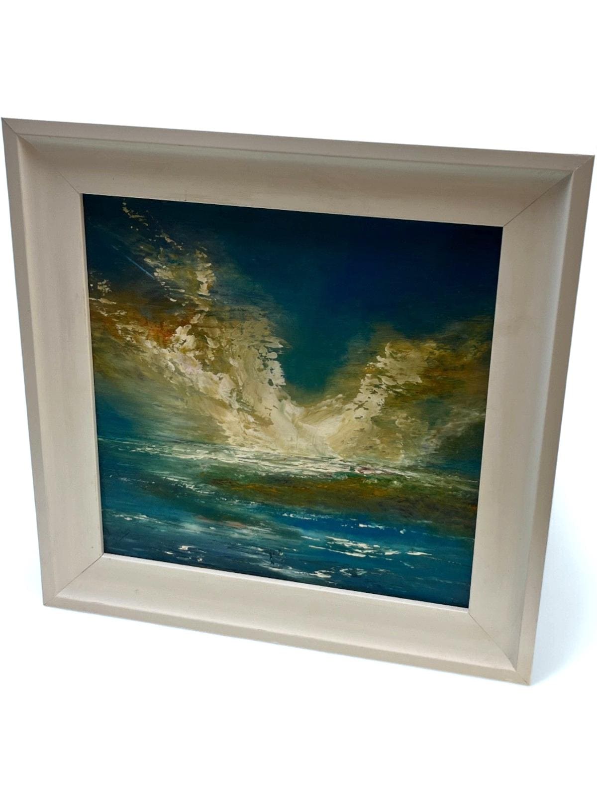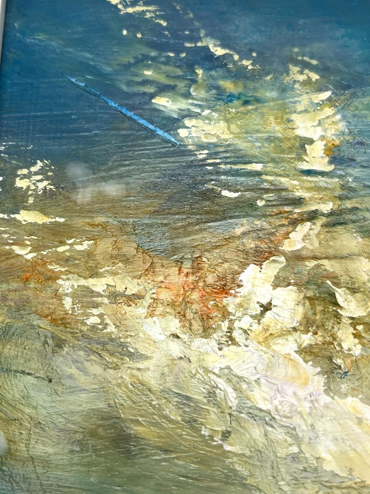 A striking original oil painting on board signed but I am unable to confirm or read the signature, depicting an abstract seascape in deep blues, greens and soft whites. The artwork has a strong sense of movement and light, evoking waves breaking on the shore. Painted in thick impasto layers that give the piece rich texture and depth.