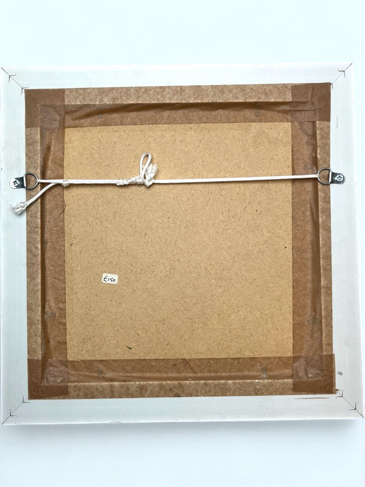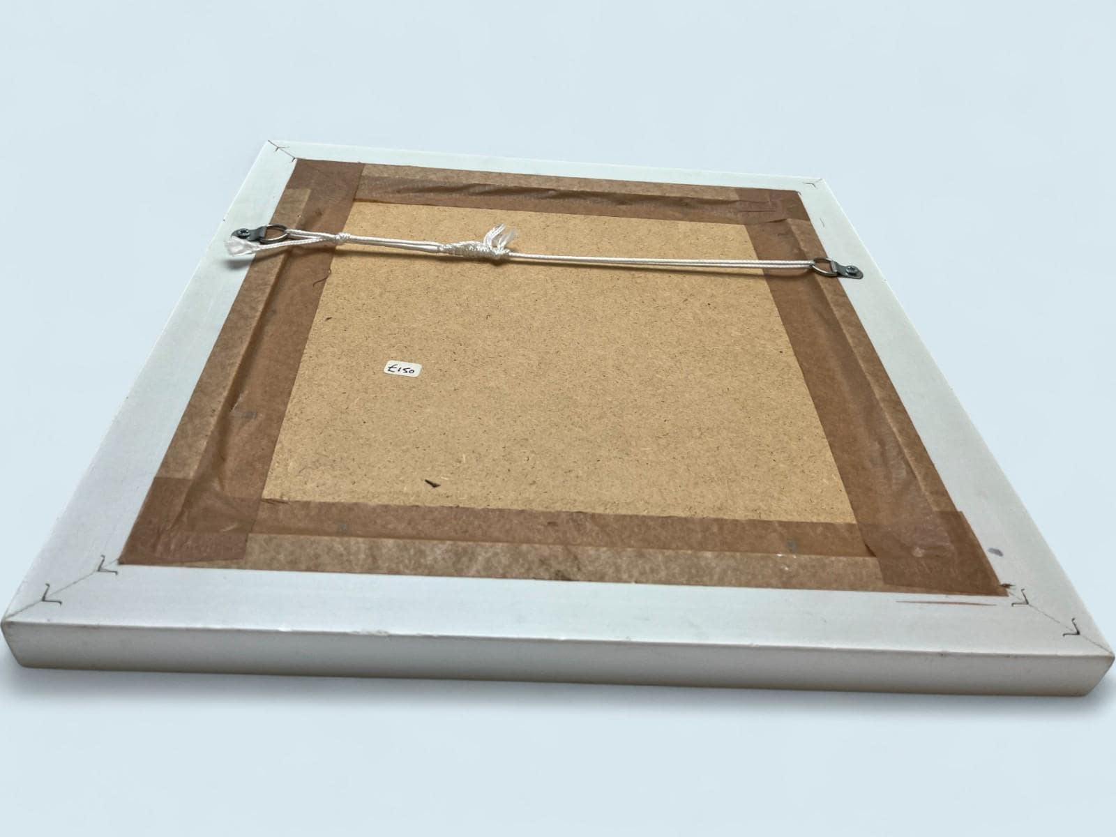 Set in a simple white wooden frame that complements the colours and style of the painting. Original price sticker of £150 sill in place from the gallery on the back.