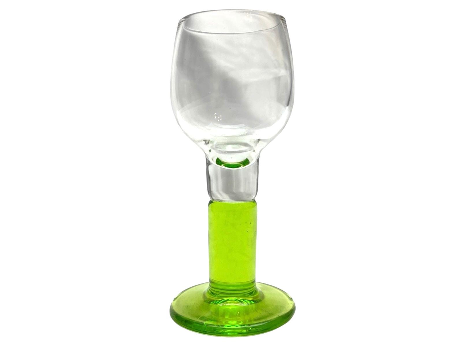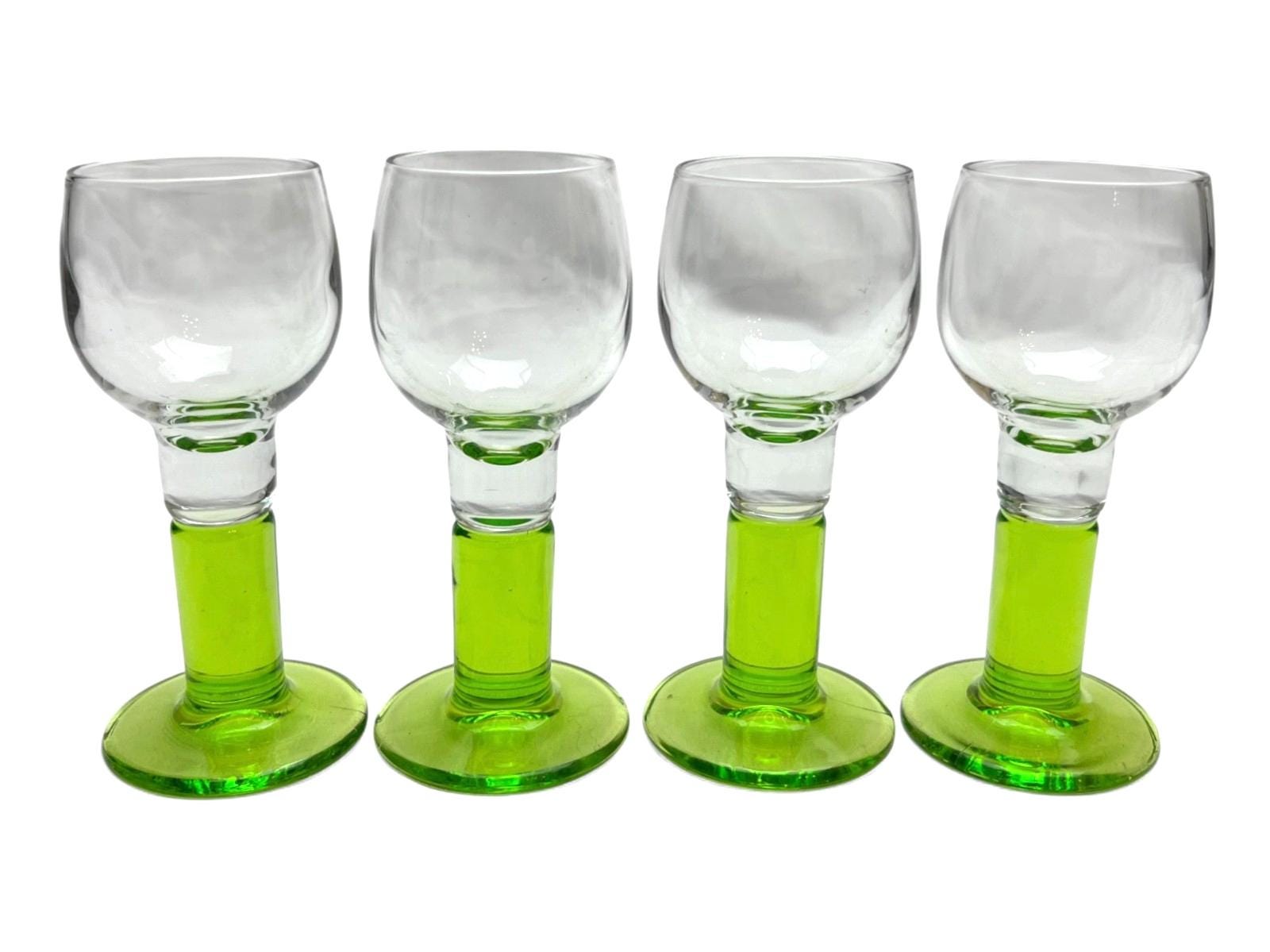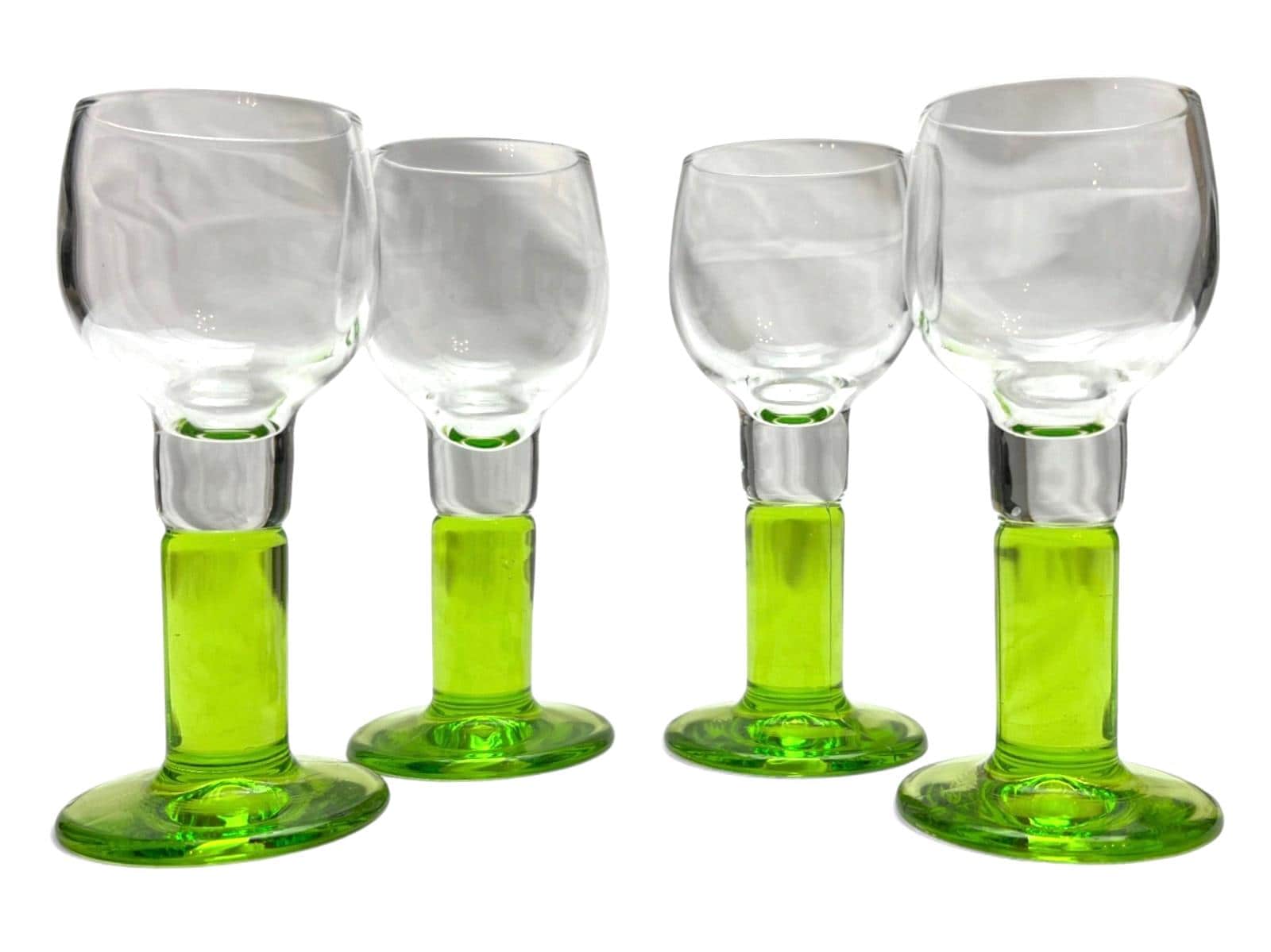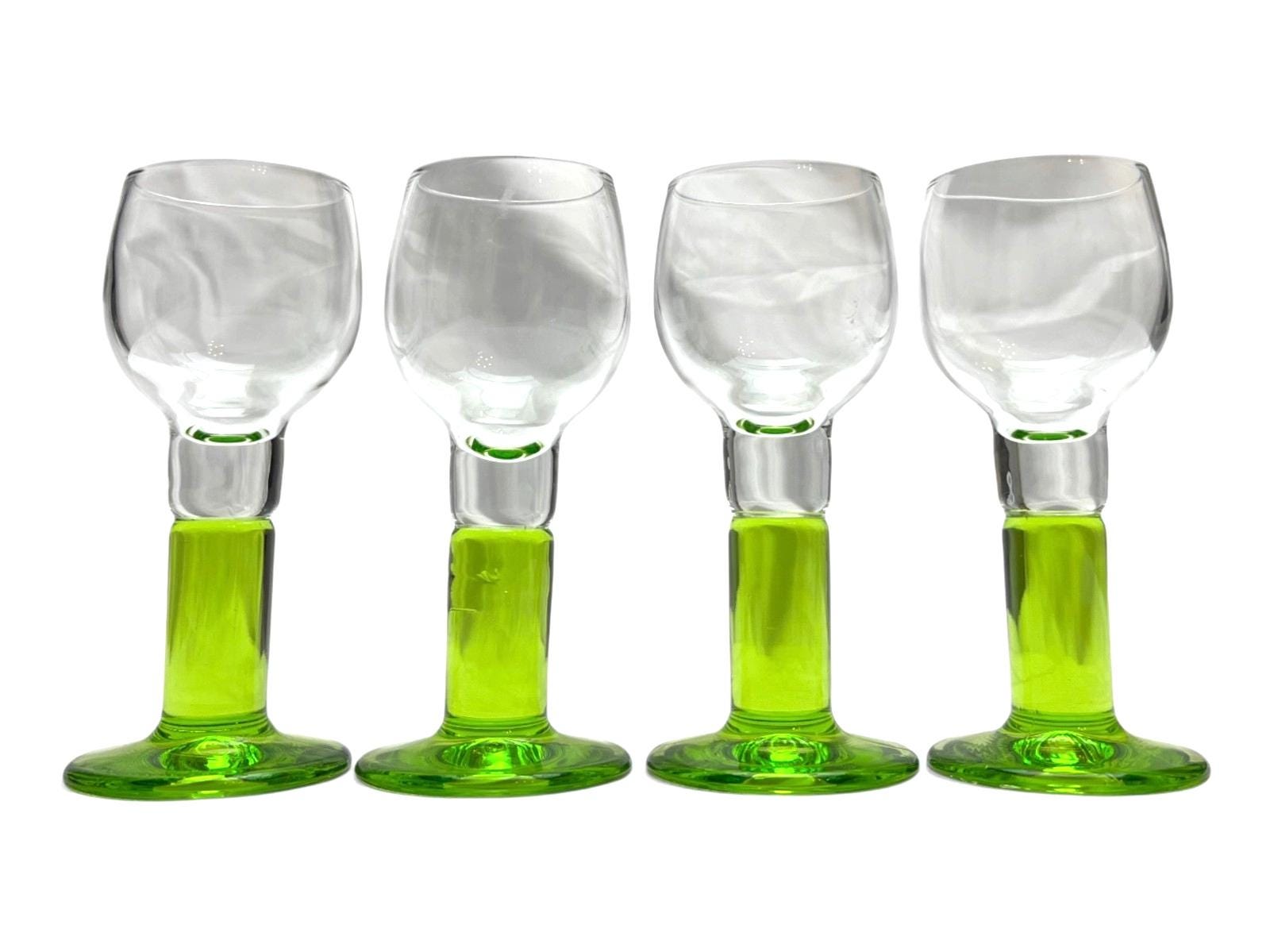 A stylish set of 4 vintage hand-blown Bormioli Rocco Limoncino glasses featuring clear bowls and striking lime-green stems and bases. Their bold colour and modernist design make them perfect for a mid-century or retro barware collection.