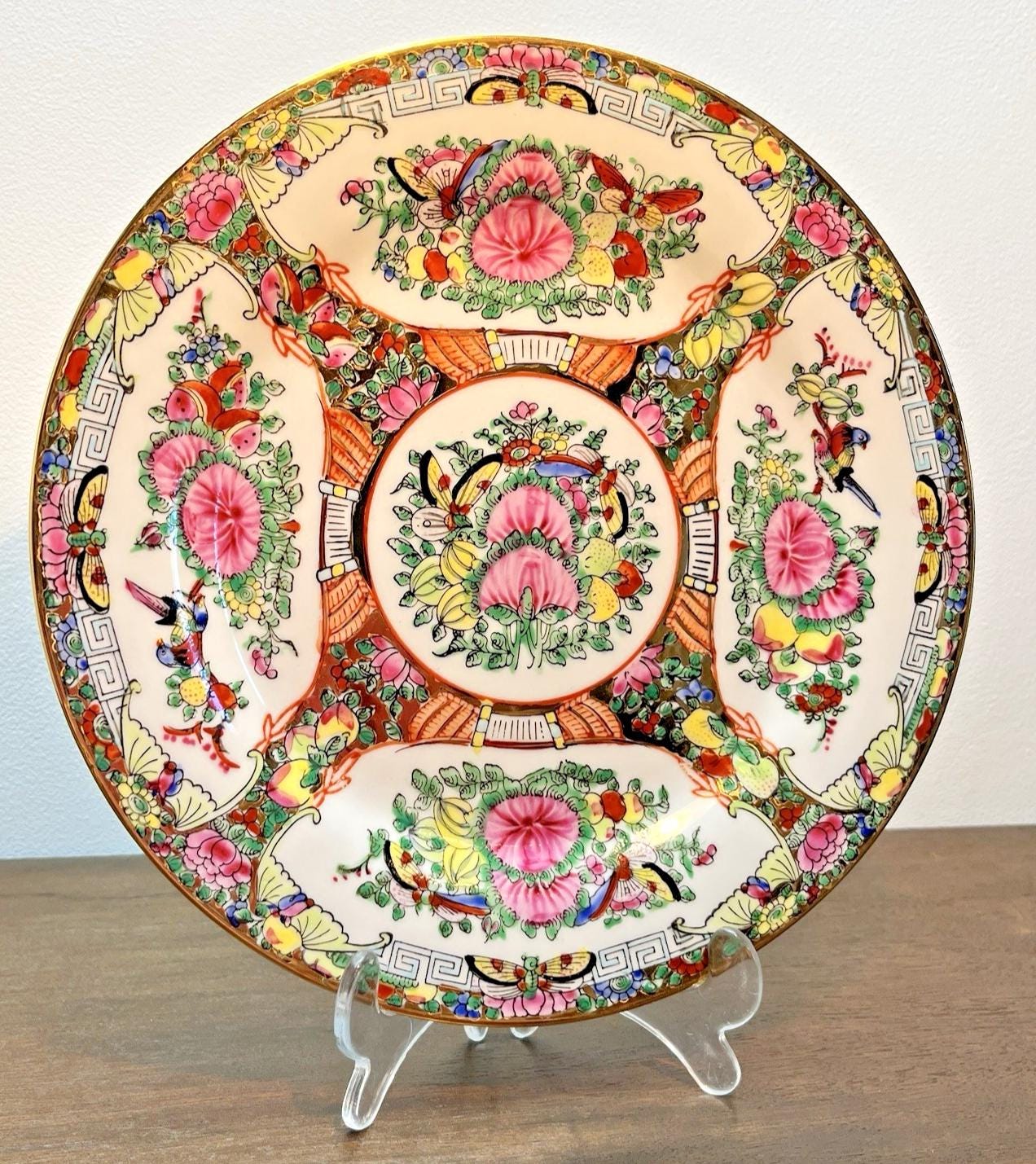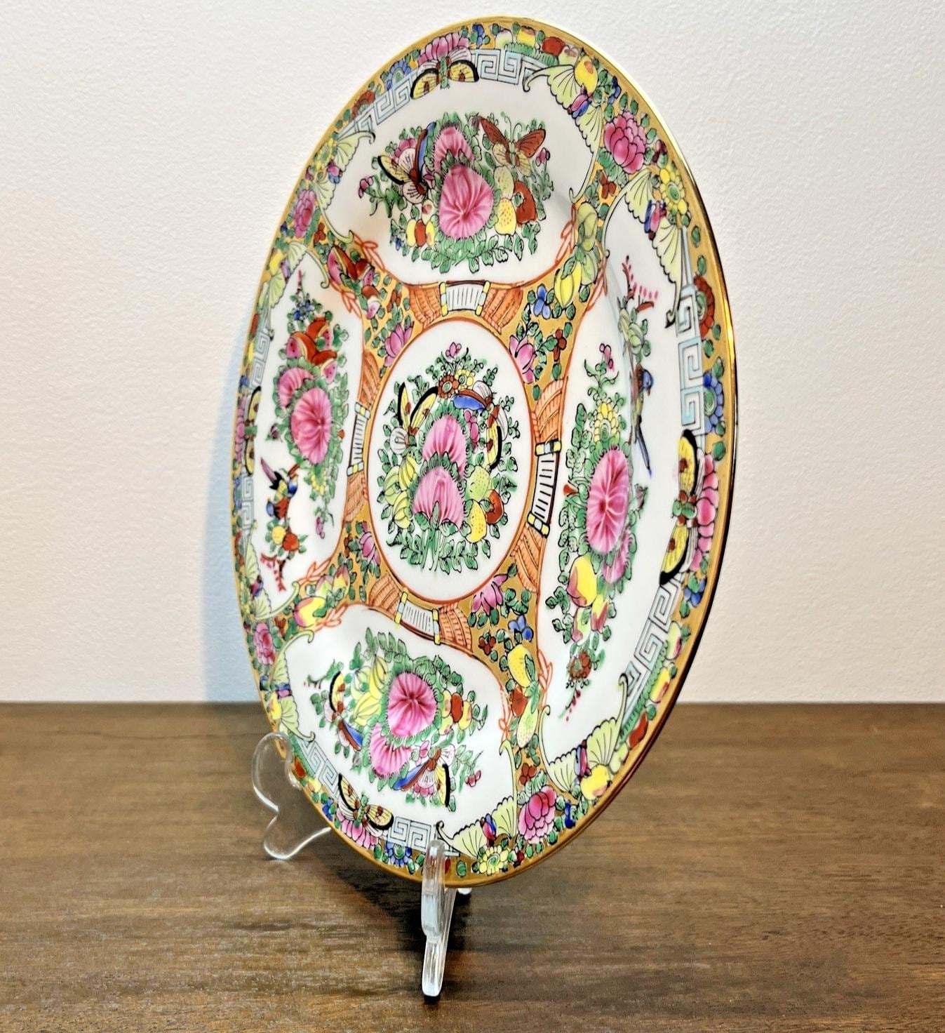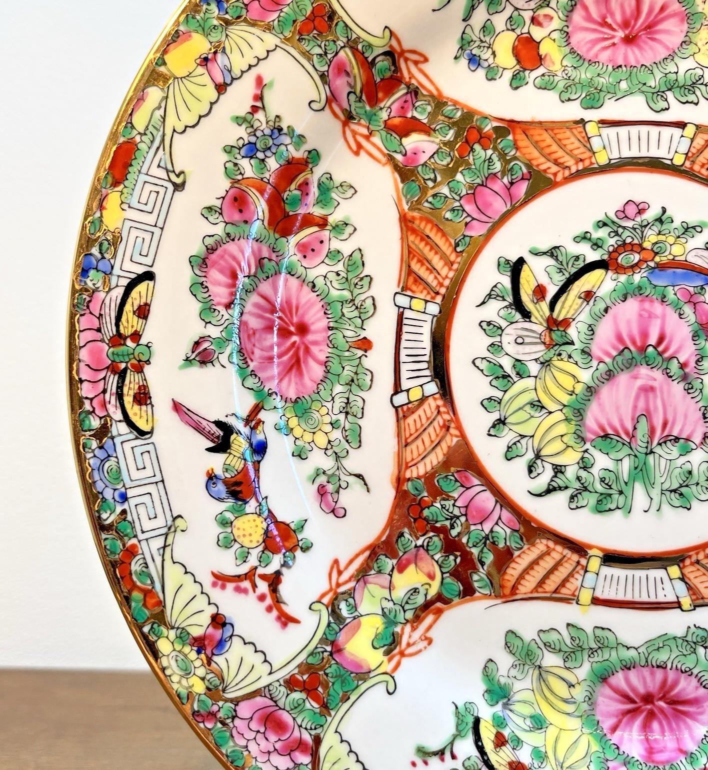 A stunning vintage Chinese Rose Medallion porcelain plate, beautifully hand painted in the Famille Rose style. This vibrant decorative piece features intricate floral, bird, butterfly, and fruit motifs in rich shades of pink, green, yellow, and orange, all highlighted with delicate gilt detailing around the rim.