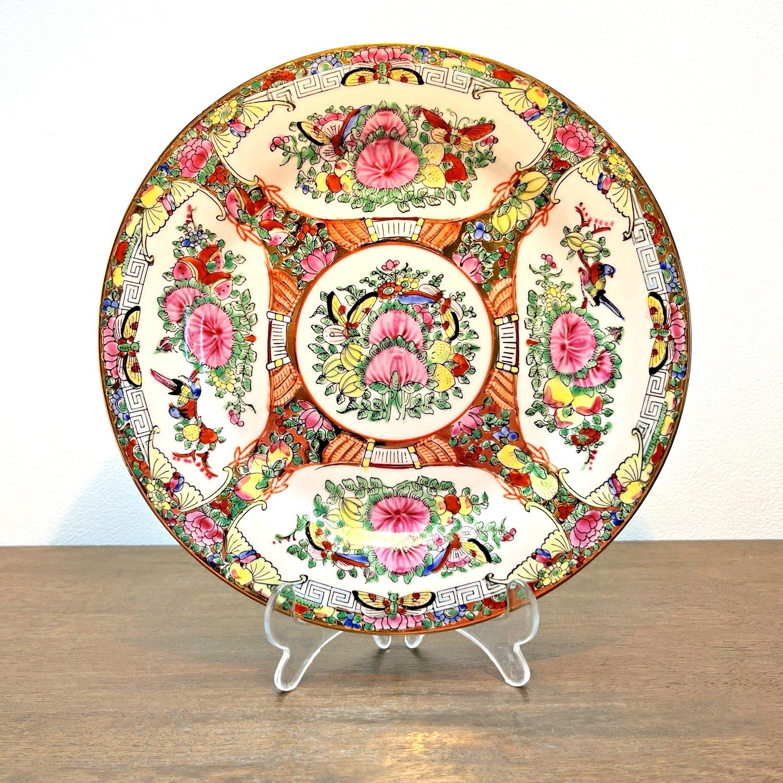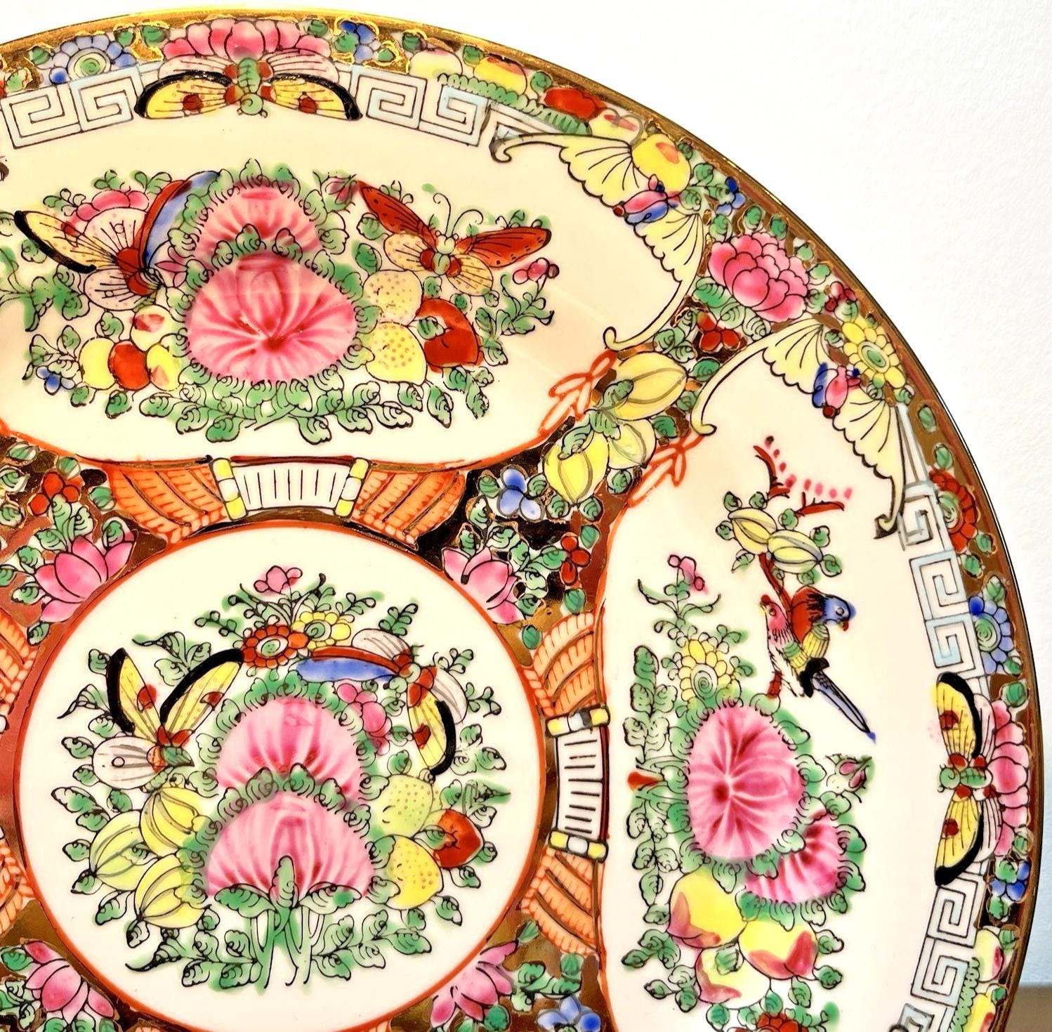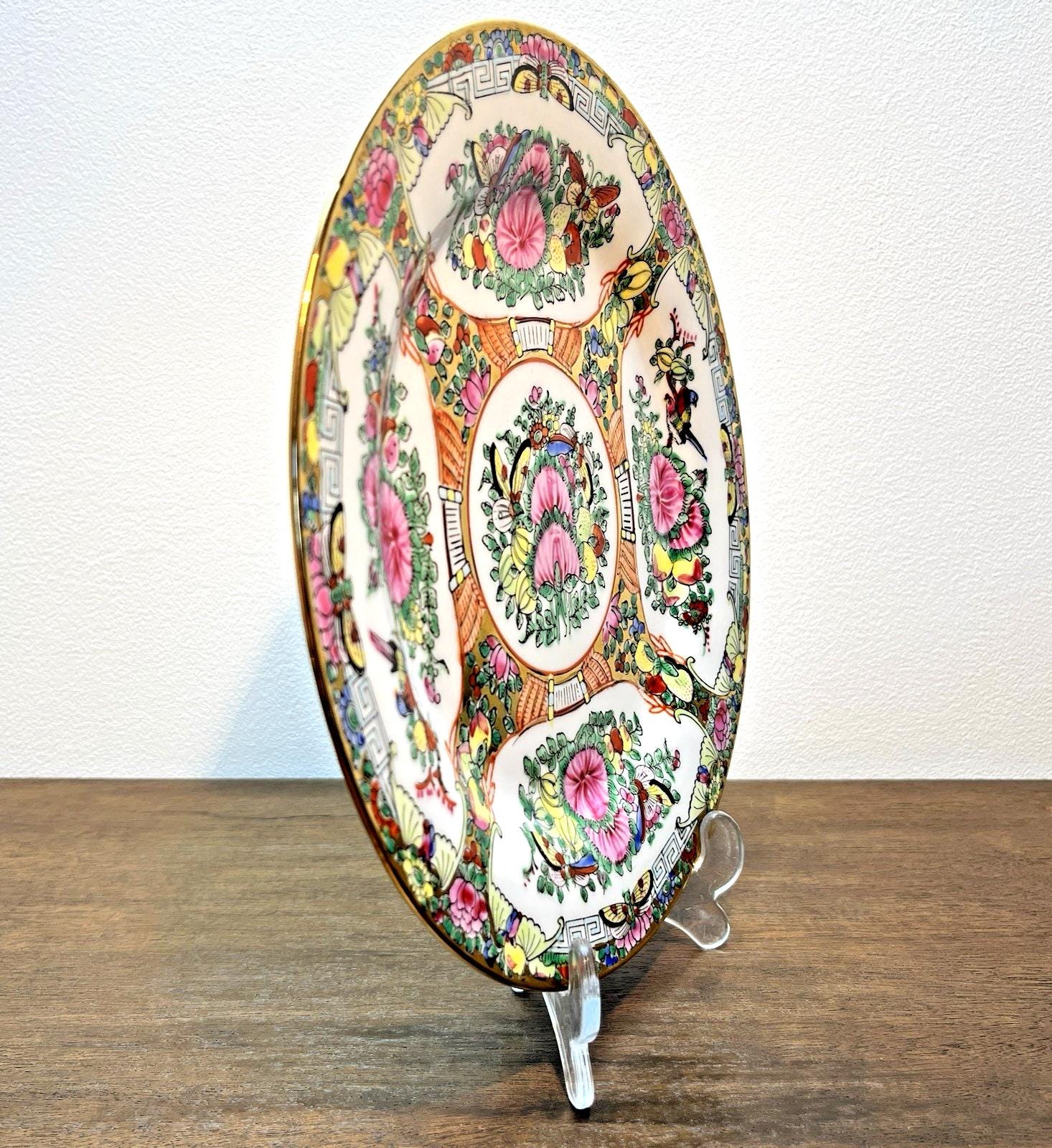 A stunning vintage Chinese Rose Medallion porcelain plate, beautifully hand painted in the Famille Rose style. This vibrant decorative piece features intricate floral, bird, butterfly, and fruit motifs in rich shades of pink, green, yellow, and orange, all highlighted with delicate gilt detailing around the rim.