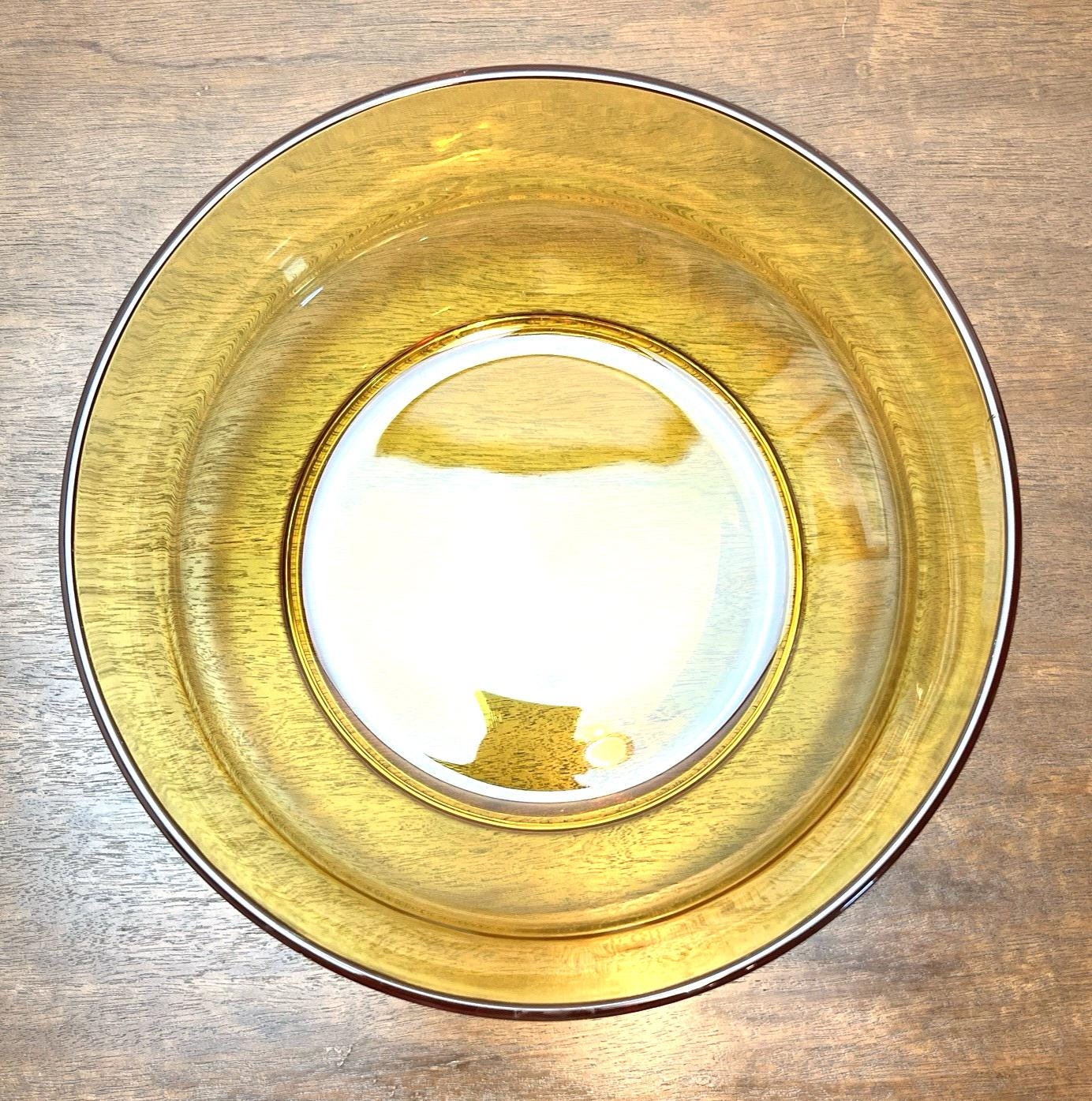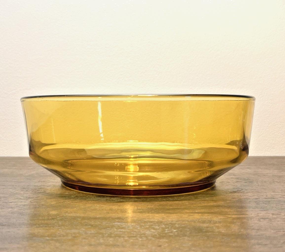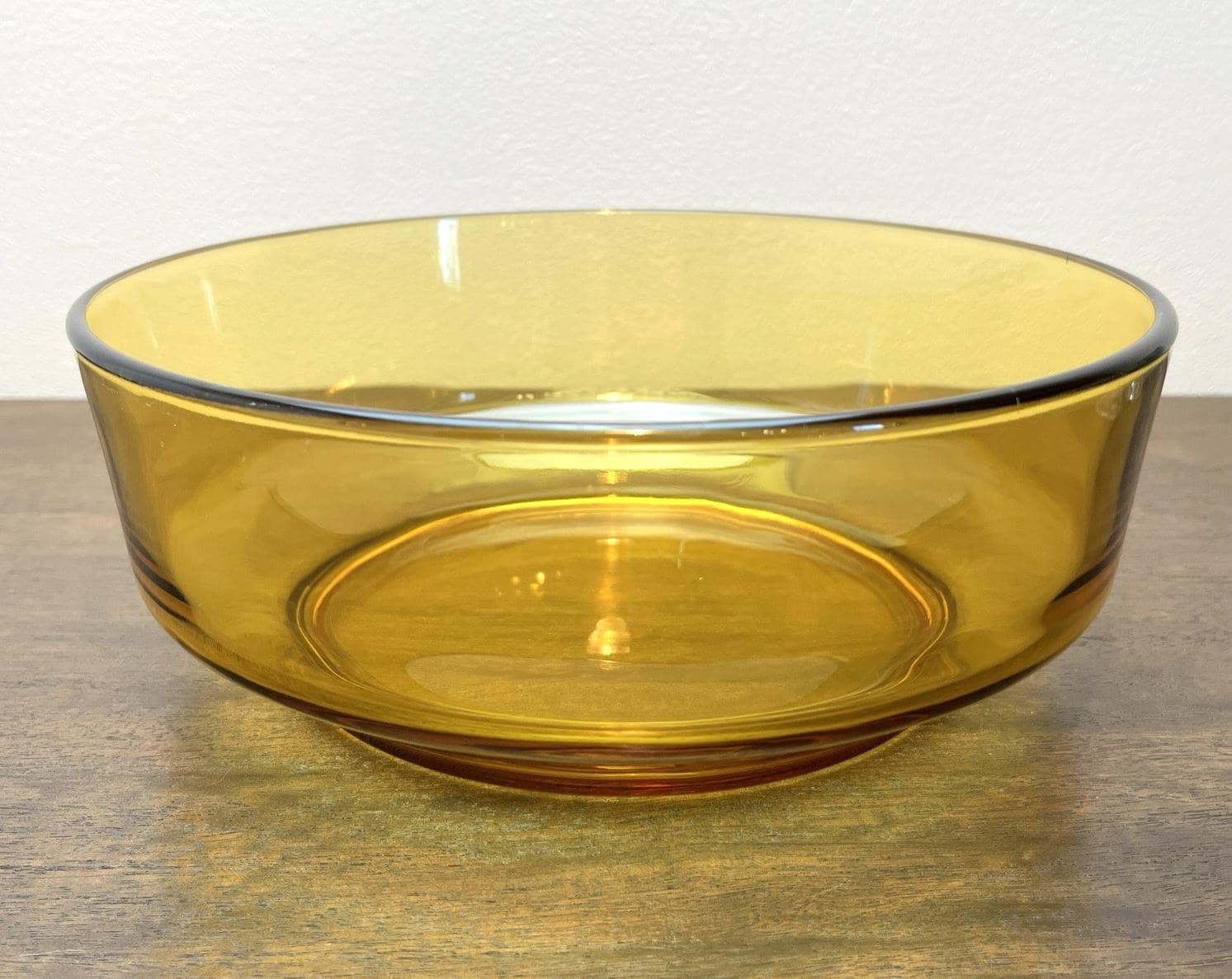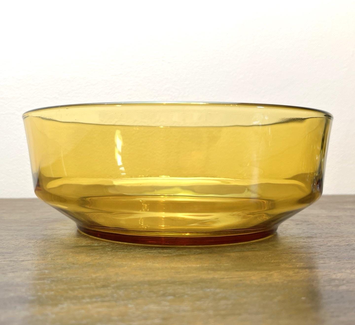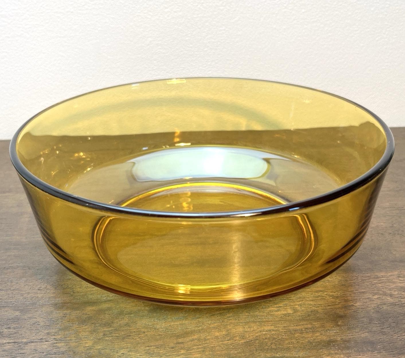 A striking vintage amber glass bowl in a deep golden tone by Italian maker, Rocco Bormioli. This piece has a clean round shape making it ideal as a serving dish, fruit bowl, or decorative centrepiece. Its retro design and warm amber colour make it a perfect fit for mid century interiors or collectors of vintage glassware.