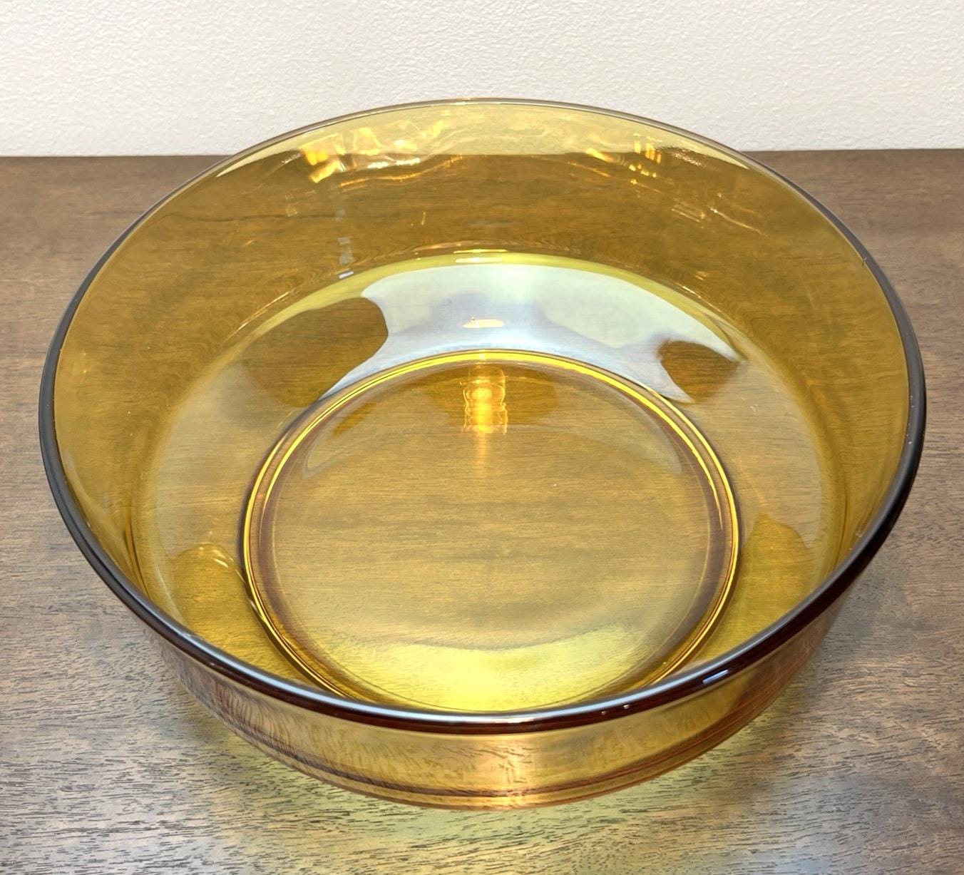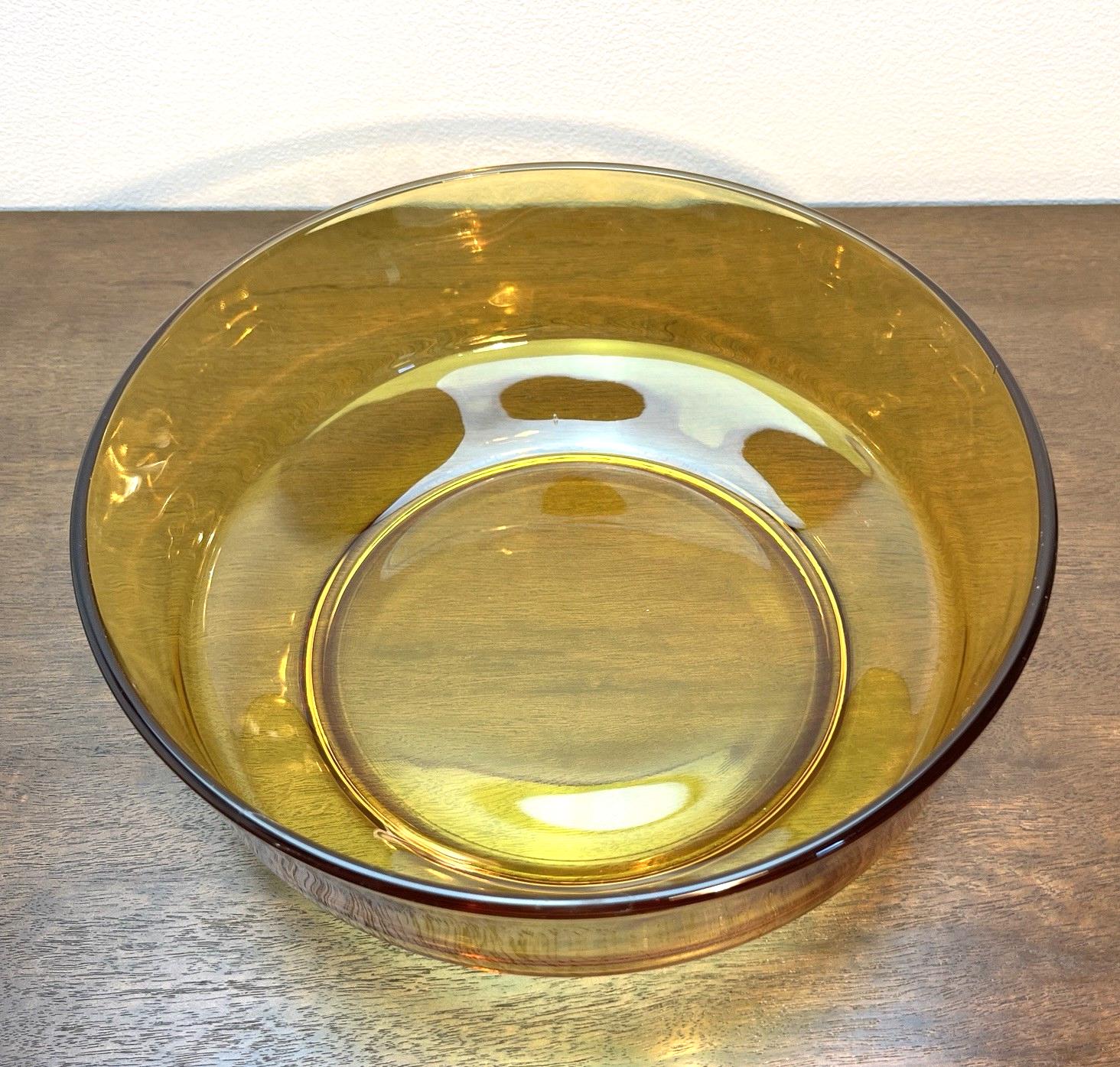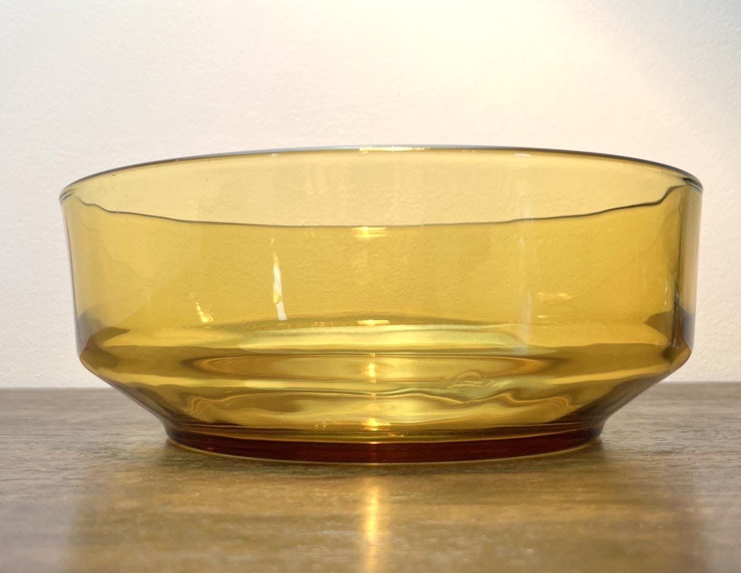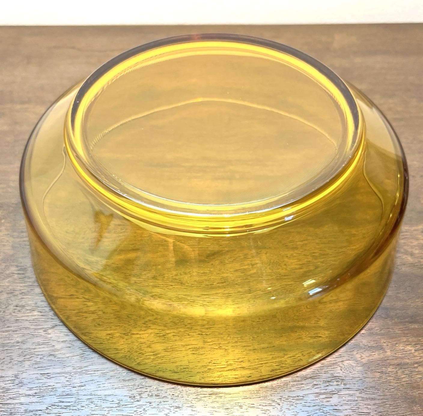 A striking vintage amber glass bowl in a deep golden tone by Italian maker, Rocco Bormioli. This piece has a clean round shape making it ideal as a serving dish, fruit bowl, or decorative centrepiece. Its retro design and warm amber colour make it a perfect fit for mid century interiors or collectors of vintage glassware.