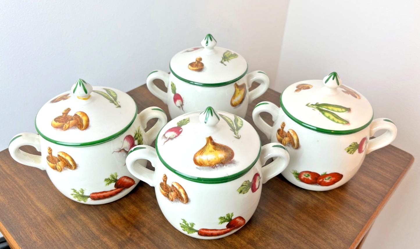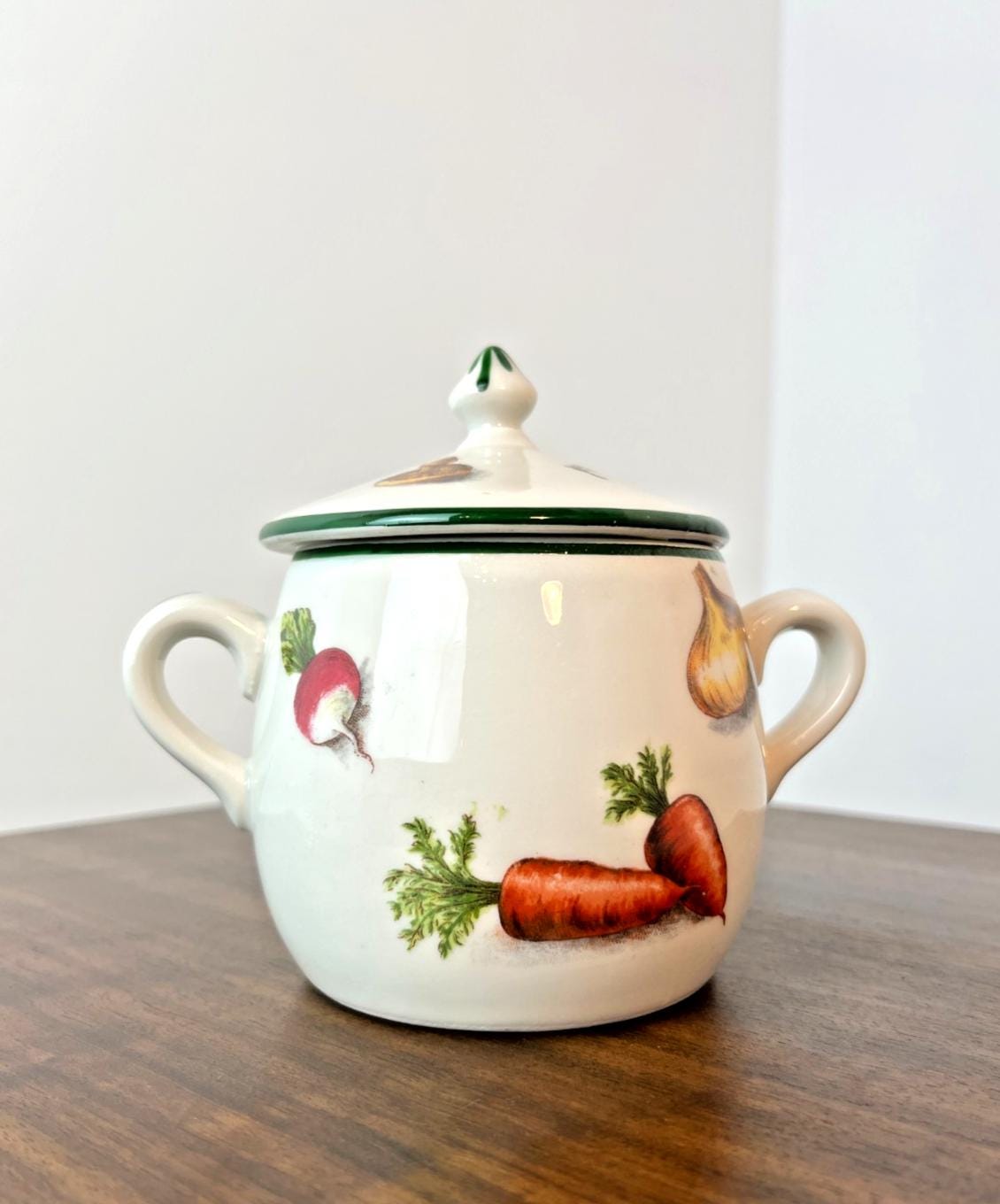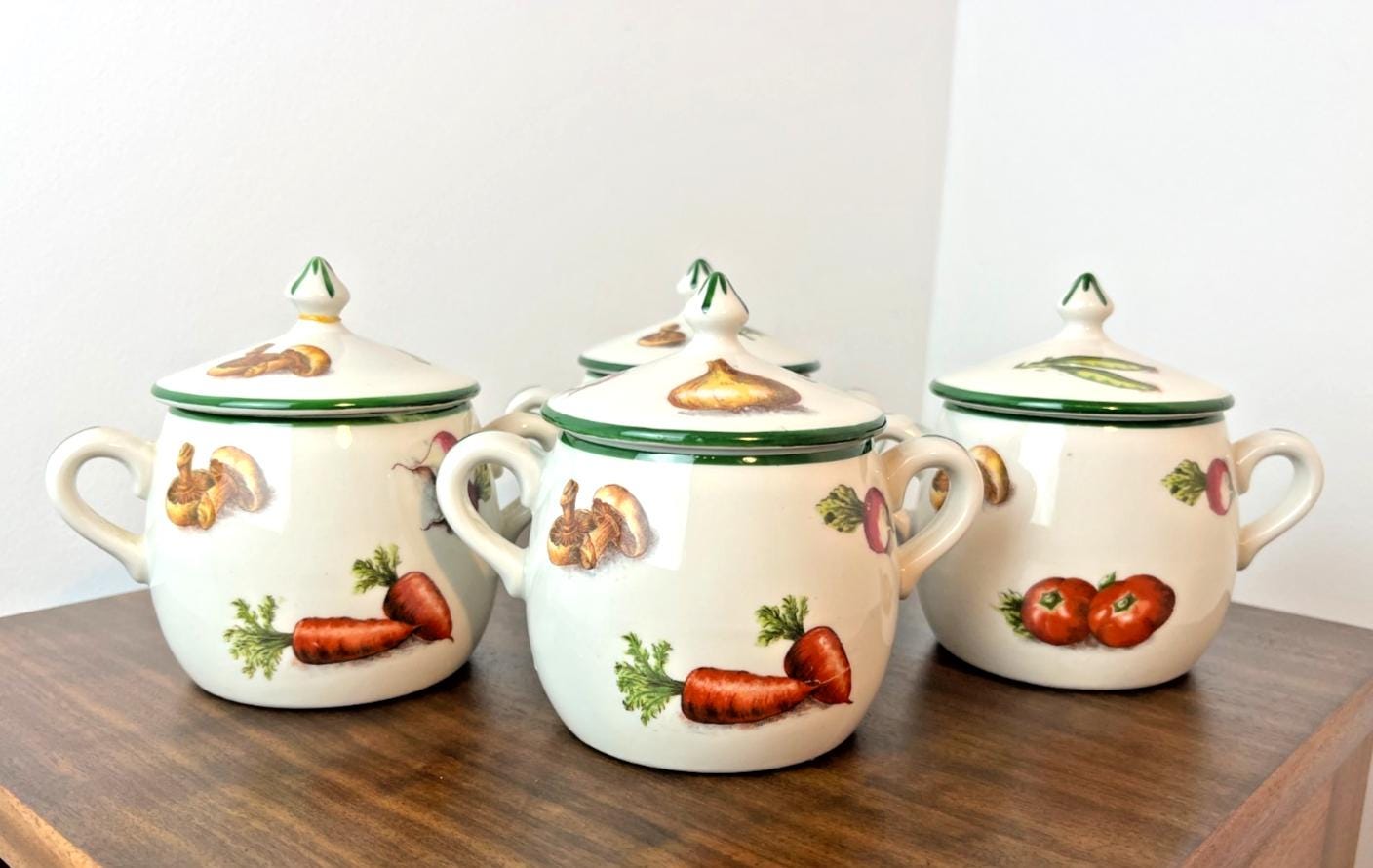 Set of eight vintage French porcelain lidded pots by Pilivite Chomette, decorated with a charming vegetable motif on a white background. These versatile pots are ideal for baking, cooking, serving, or as decorative kitchenware.