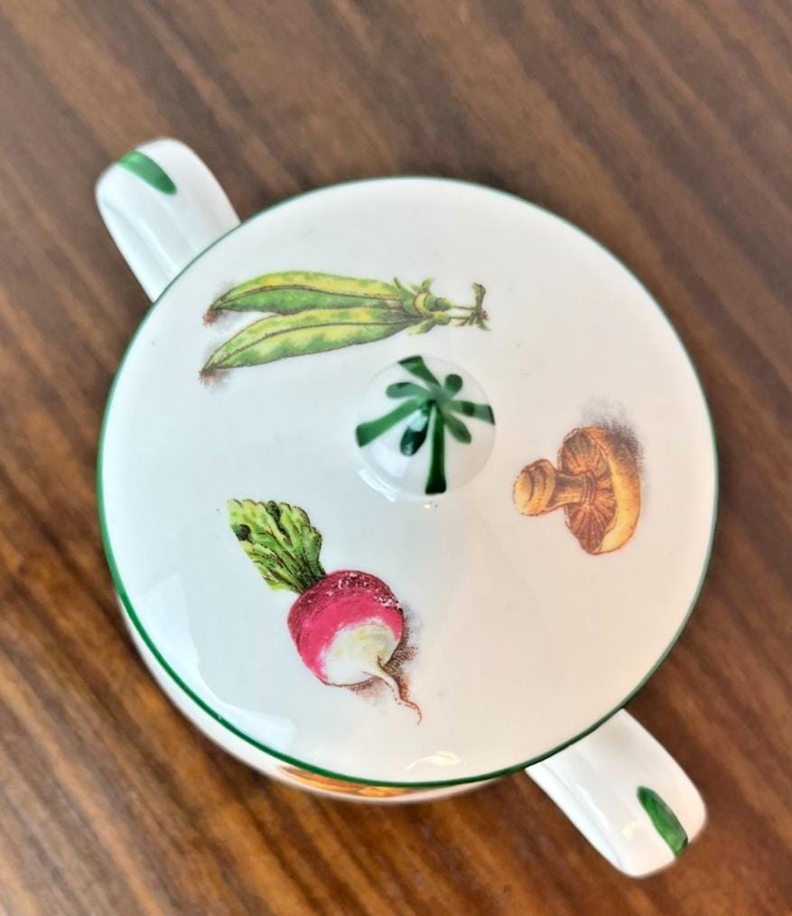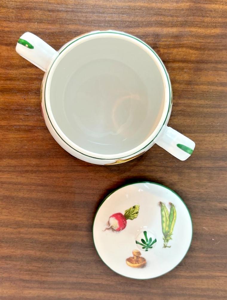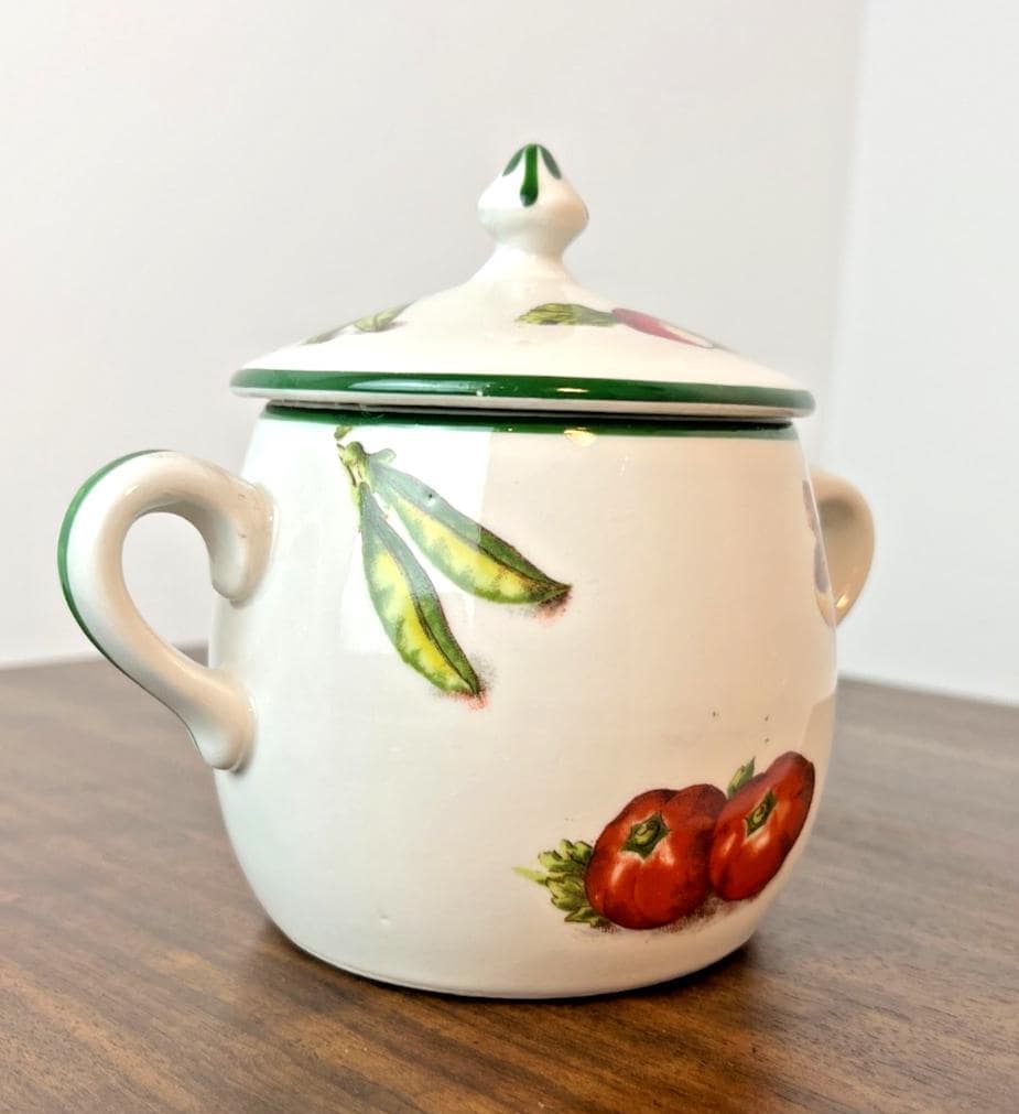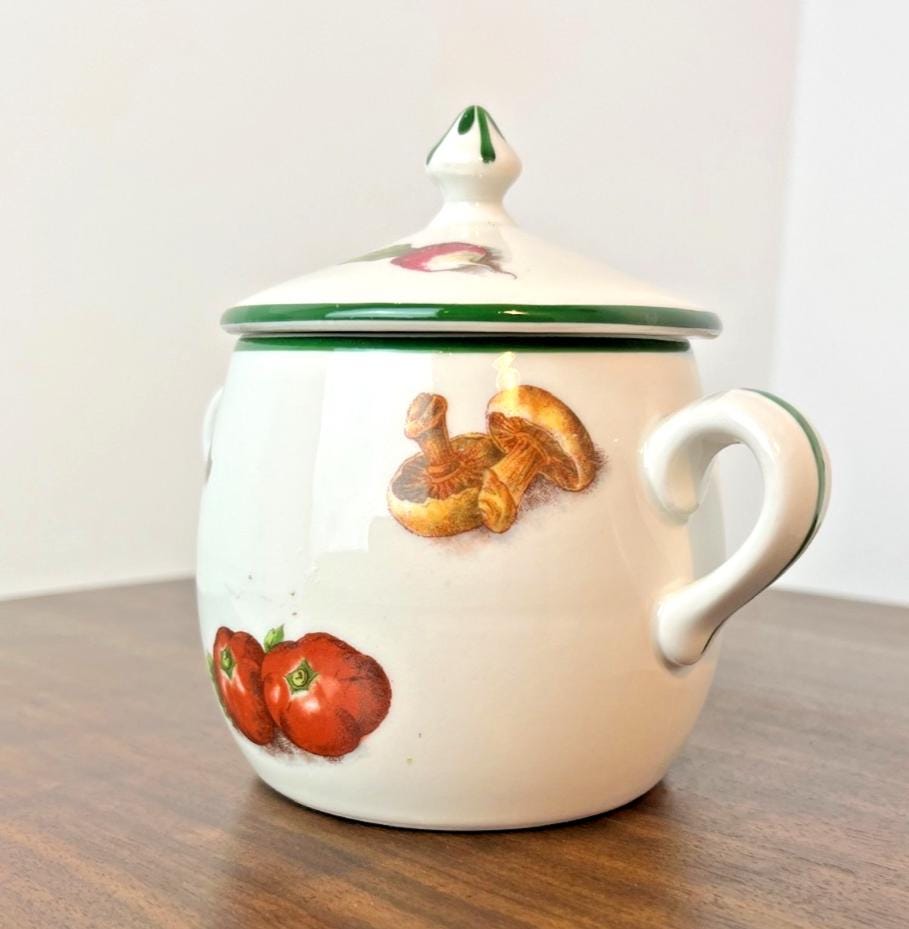 Set of eight vintage French porcelain lidded pots by Pilivite Chomette, decorated with a charming vegetable motif on a white background. These versatile pots are ideal for baking, cooking, serving, or as decorative kitchenware.