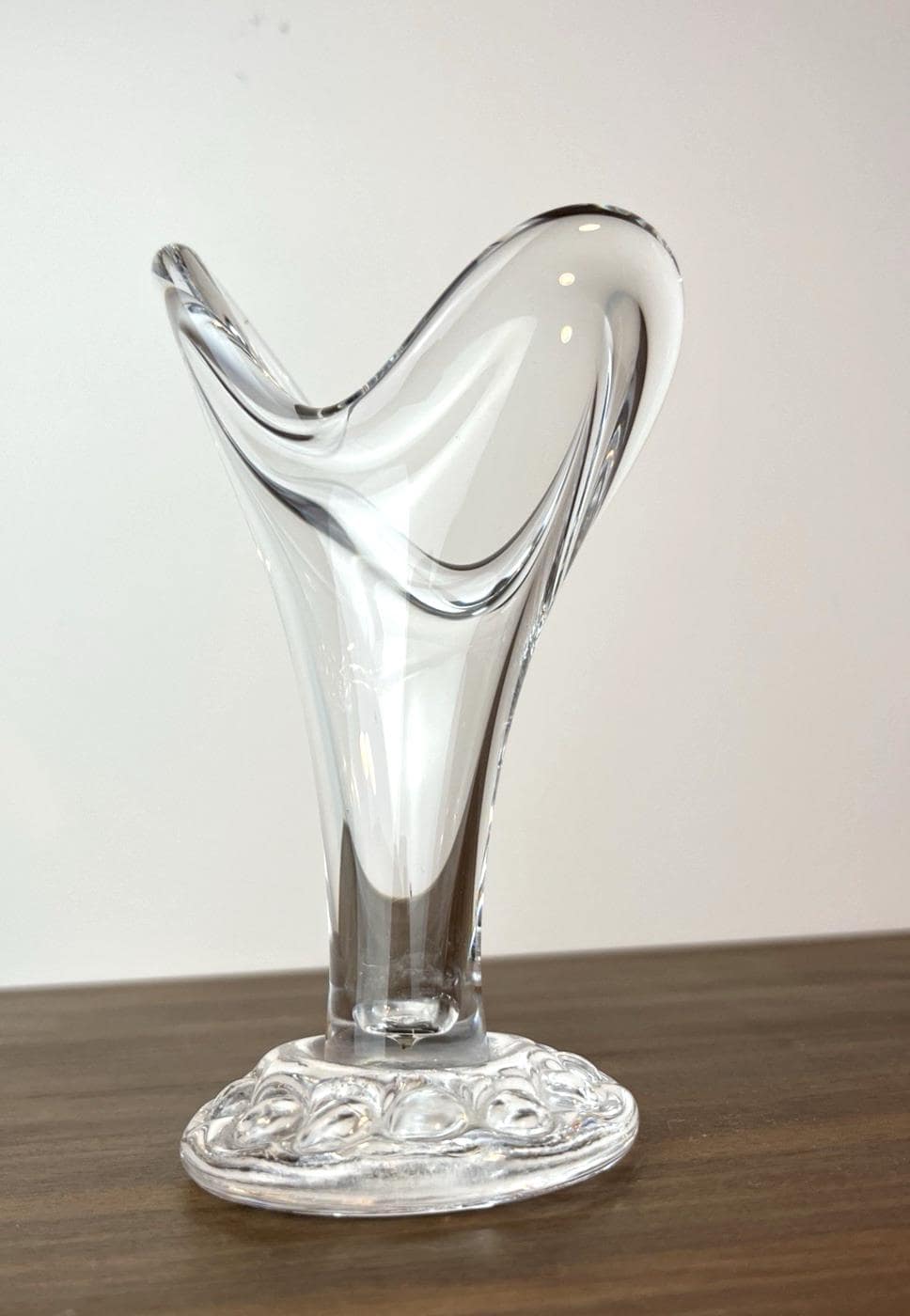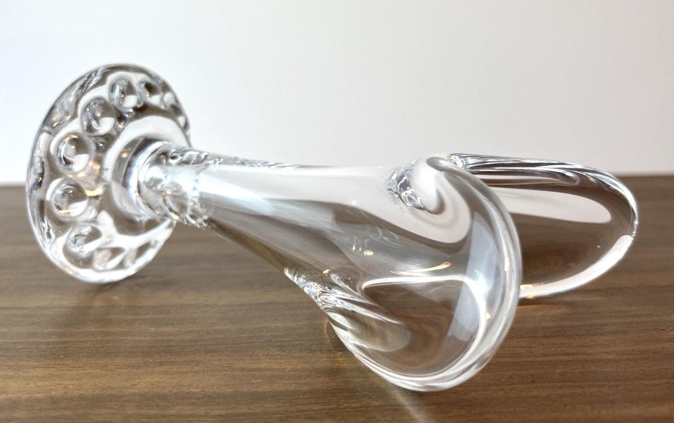 A beautiful vintage swung glass vase in clear glass with a rolled rim and circular hobnail-style base. This elegant mid-century style vase is perfect for a single stem, bud display, or small floral arrangement.