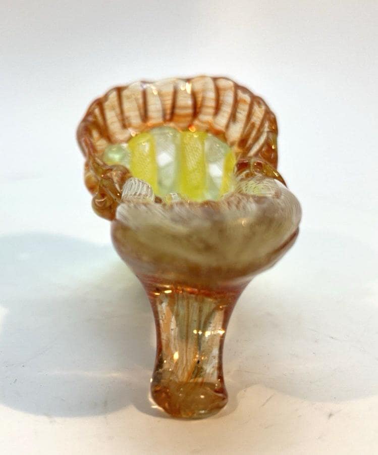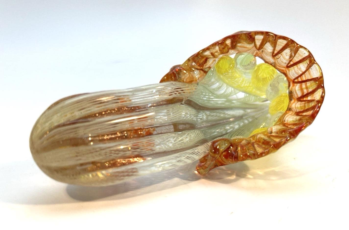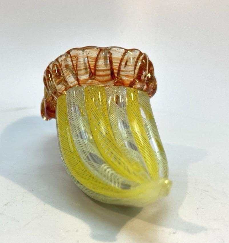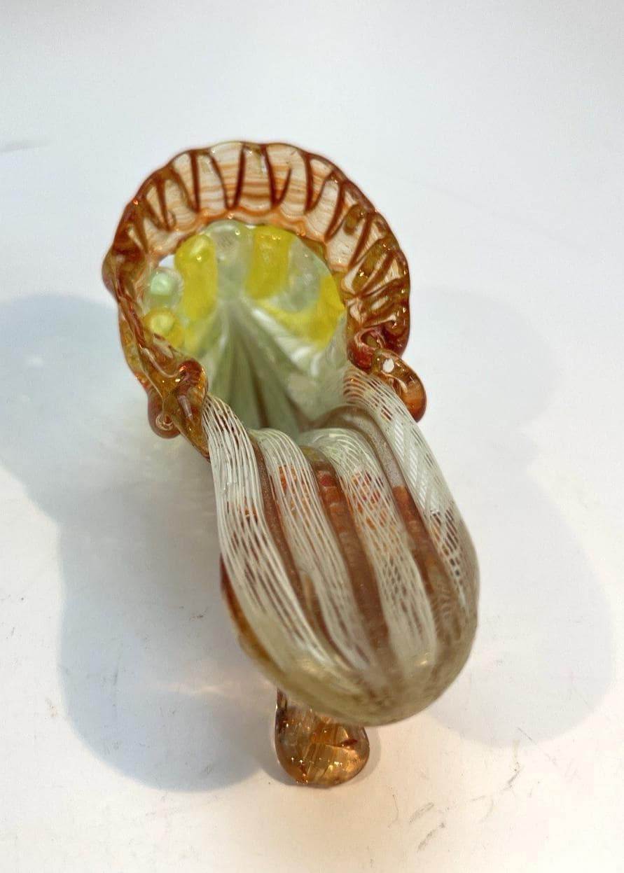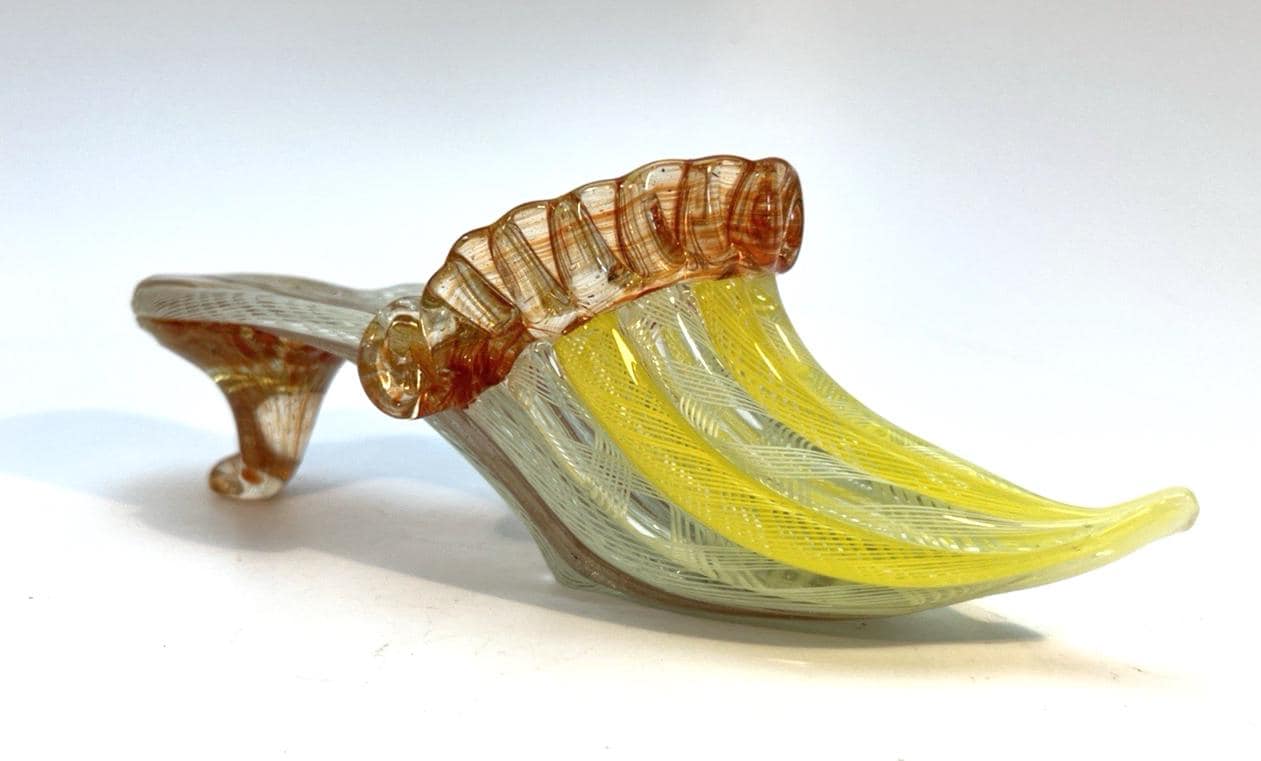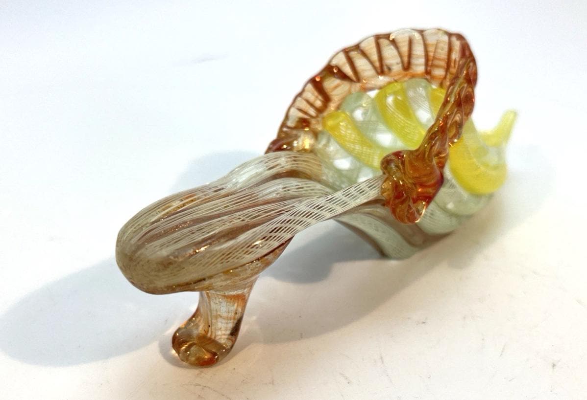 This vintage Murano glass slipper is a stunning example of Venetian glass artistry, hand made using the latticino technique in a vibrant mix of white, yellow, and red/orange glass.