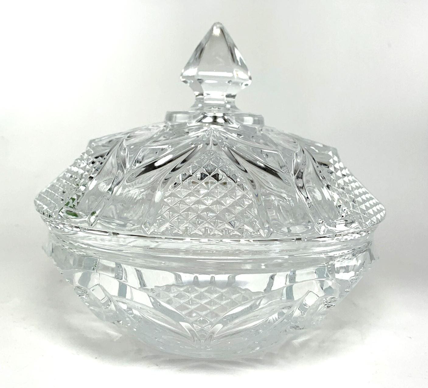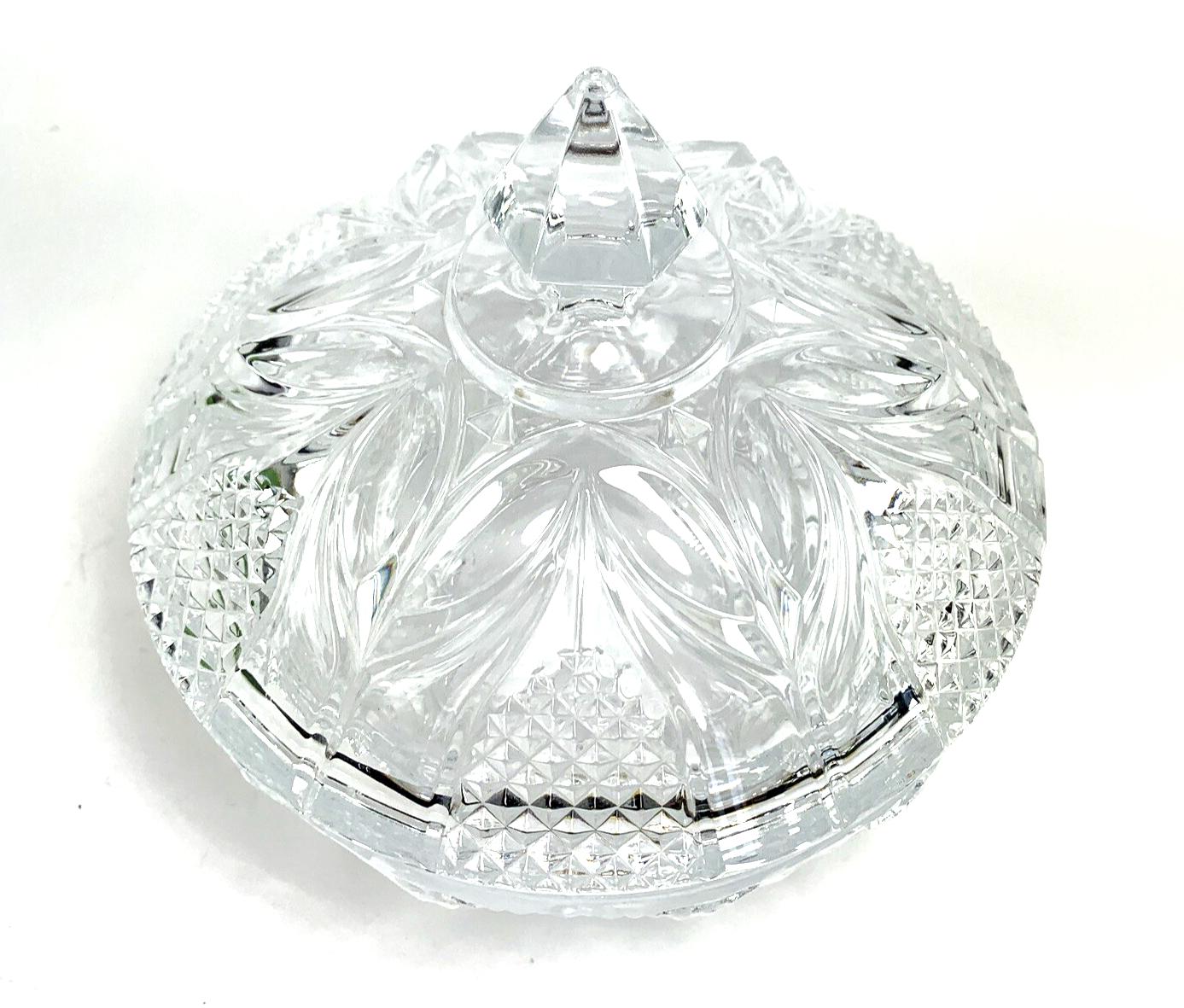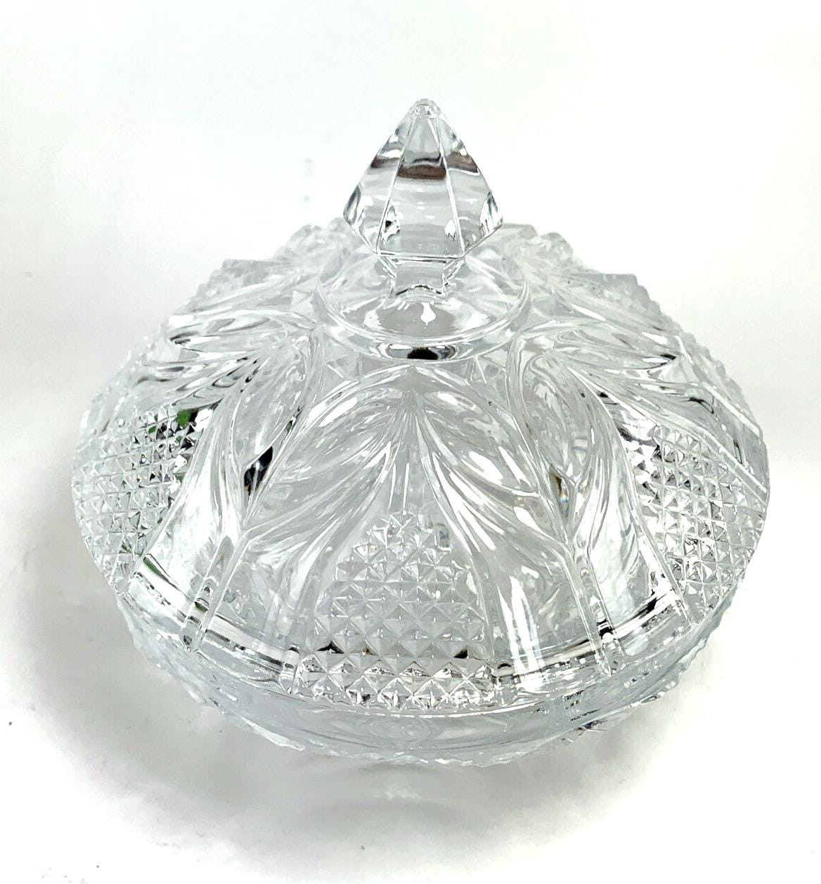 This vintage cut crystal lidded bowl is a beautifully crafted piece, featuring intricate cut patterns across the lid, sides, and base. The design includes a pointed diamond-cut handle and leaf-style motifs, offering an elegant, traditional aesthetic.