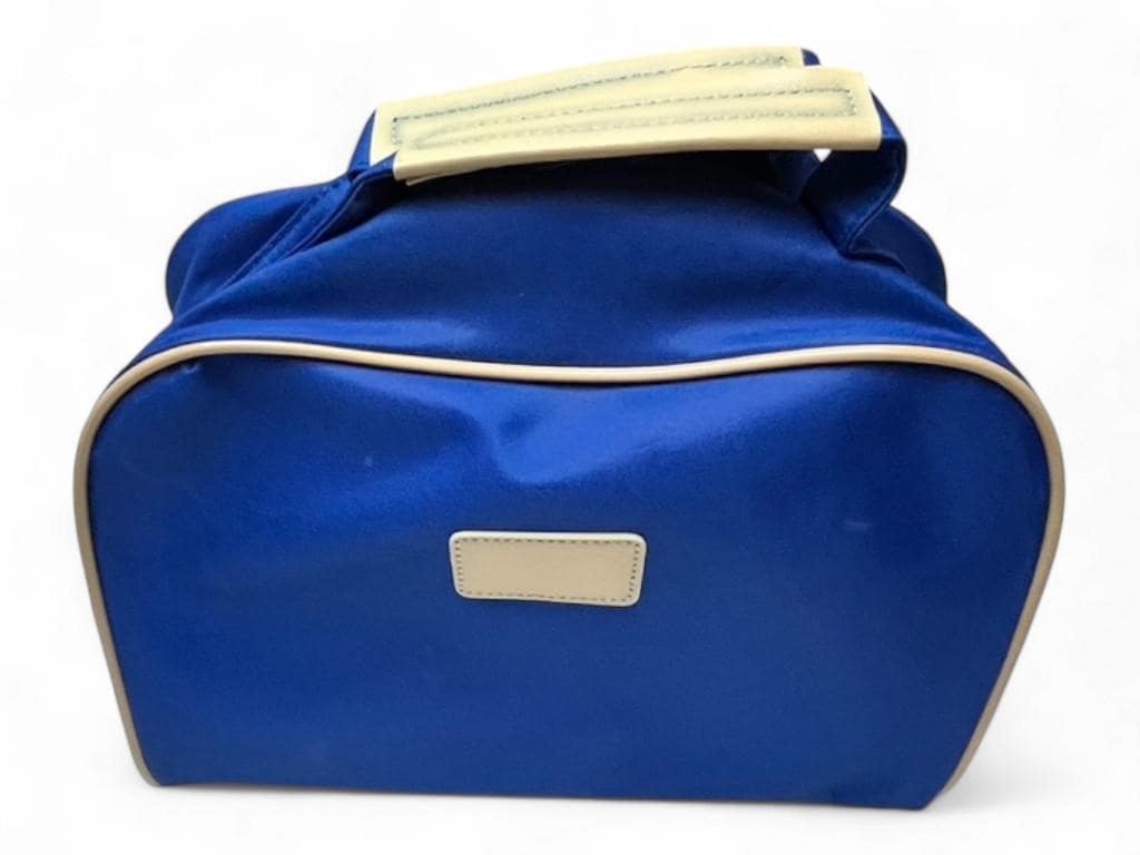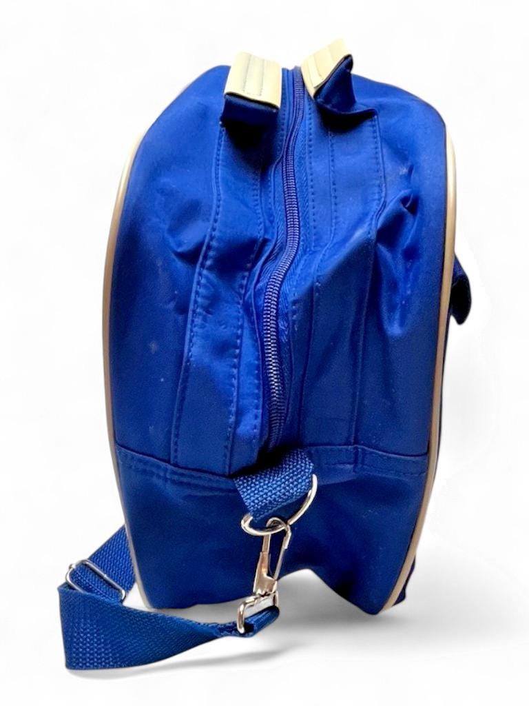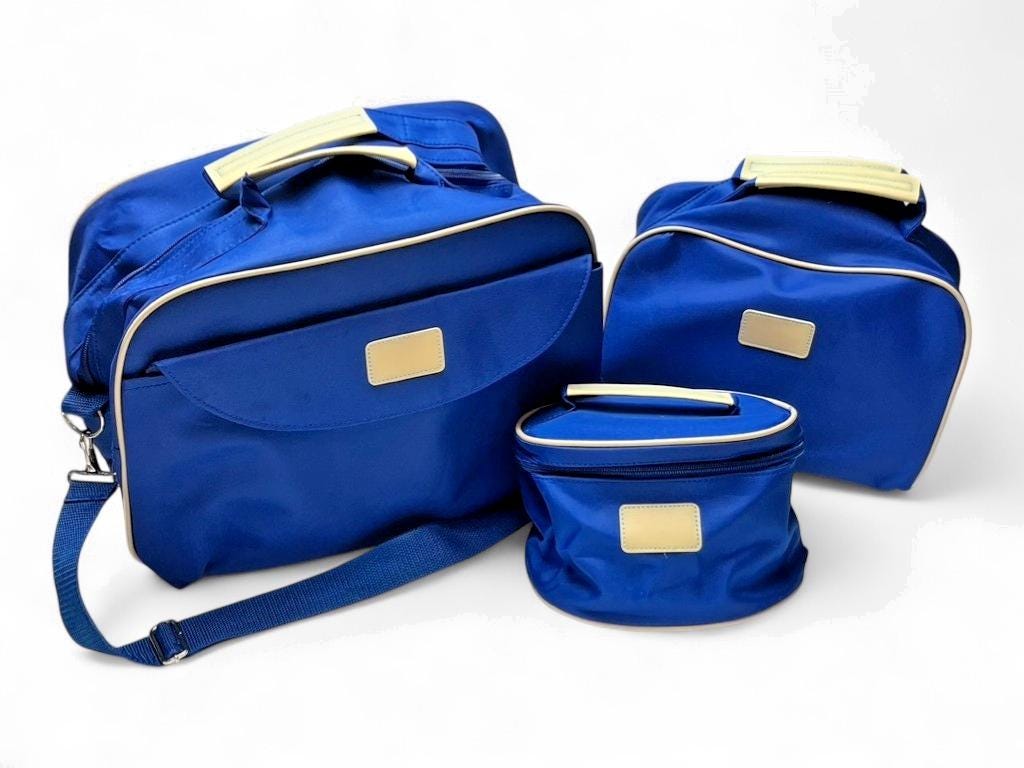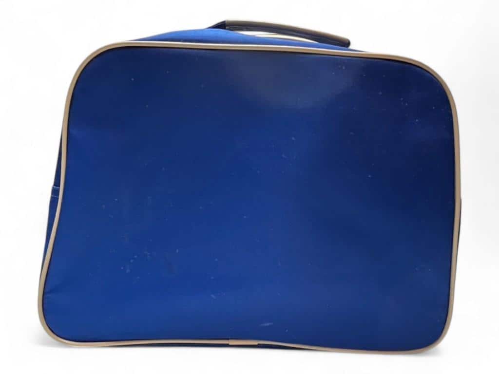 Set of 3 vintage travel bags in blue synthetic fabric. The largest has a should strap, external pocket and good capacity as a single overnight bag. Shower bag has a double handle and good space for shampoo, soap, shavers etc. and a smaller wash bag.