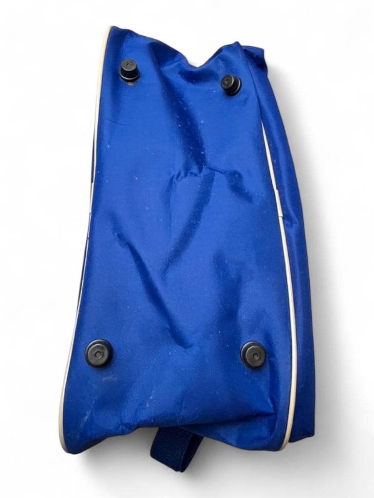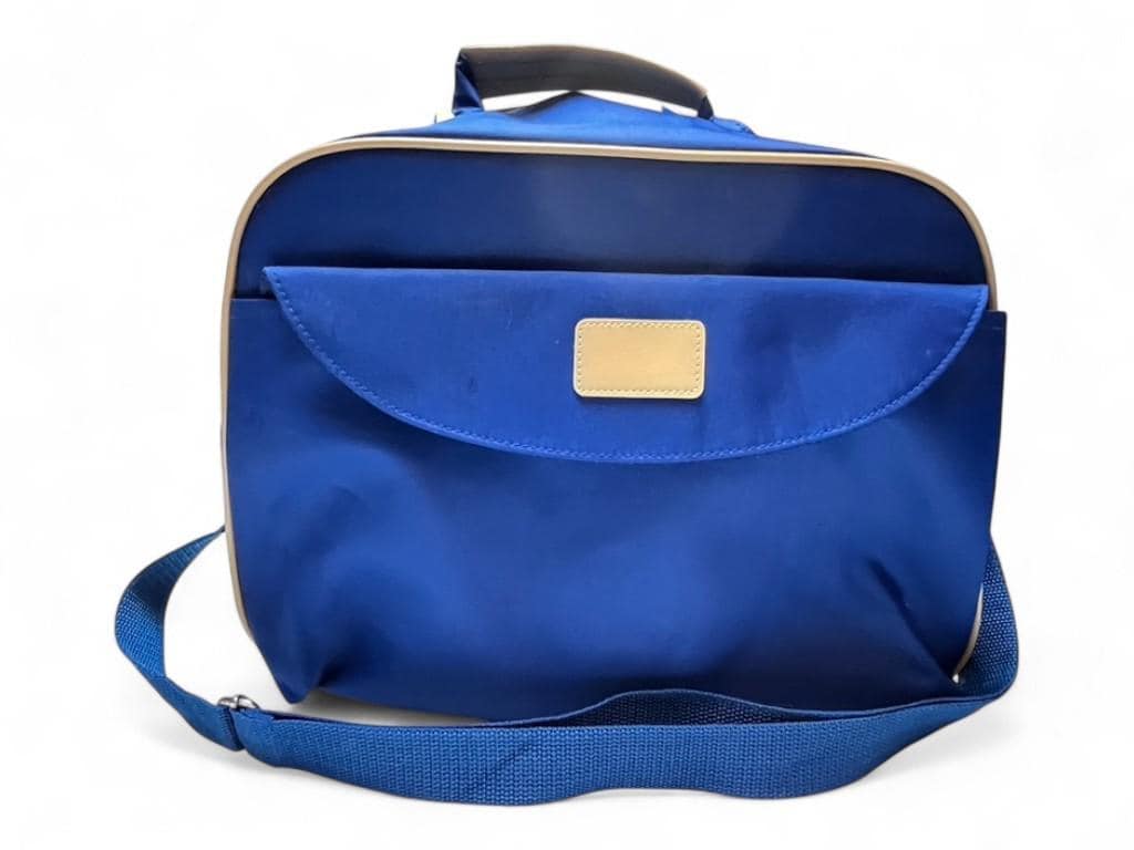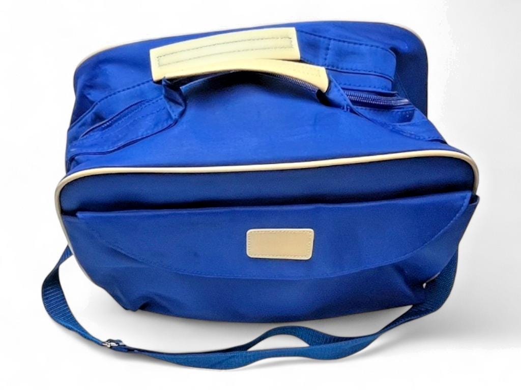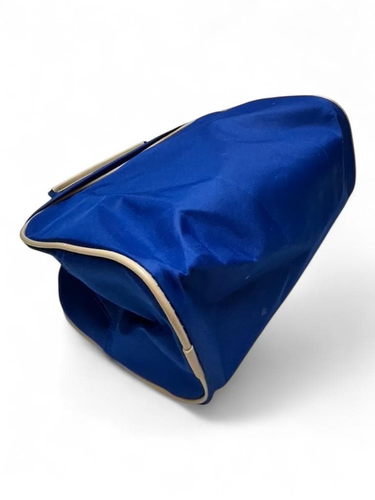 Set of 3 vintage travel bags in blue synthetic fabric. The largest has a should strap, external pocket and good capacity as a single overnight bag. Shower bag has a double handle and good space for shampoo, soap, shavers etc. and a smaller wash bag.