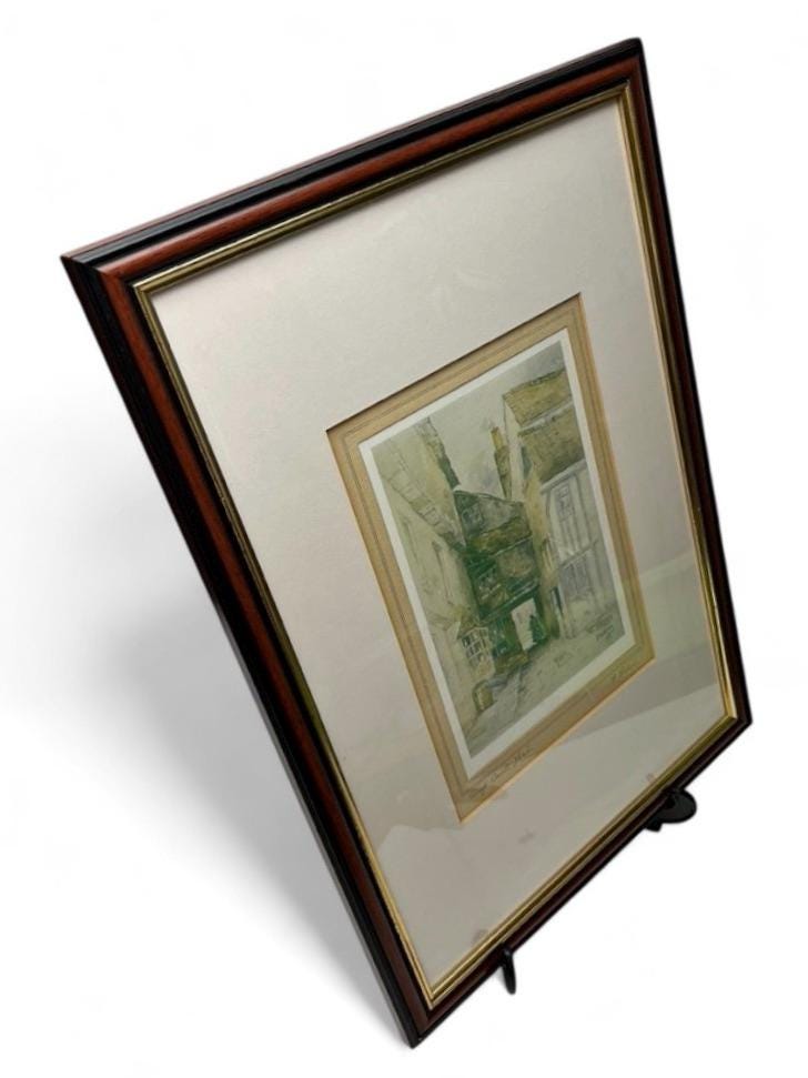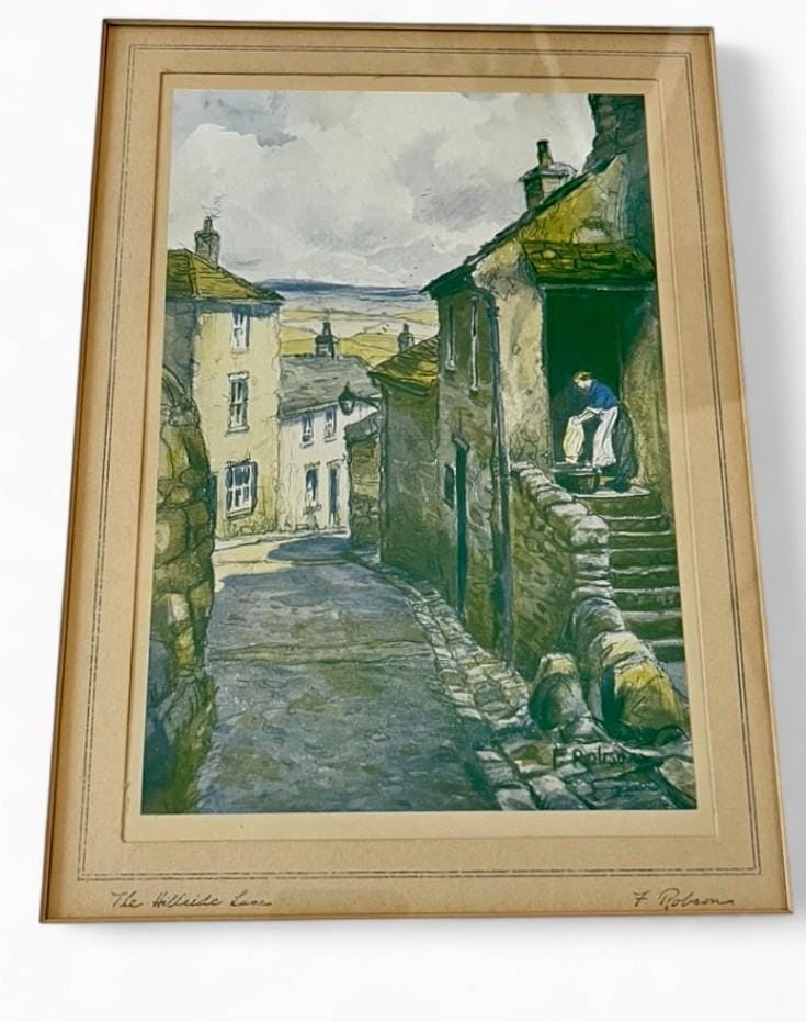 A charming set of five vintage signed prints by F. Robson, each depicting classic English architectural scenes including The King George Hotel, Barnet, Pump Court, York, York Minster from Stoneygate, The Hillside Lane, and In High Wycombe.