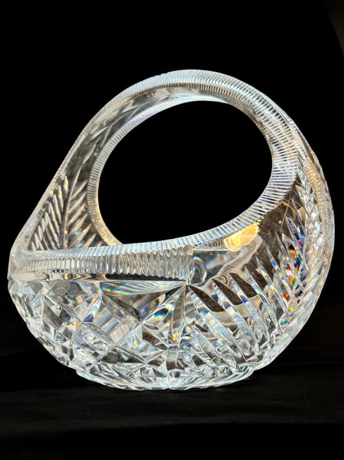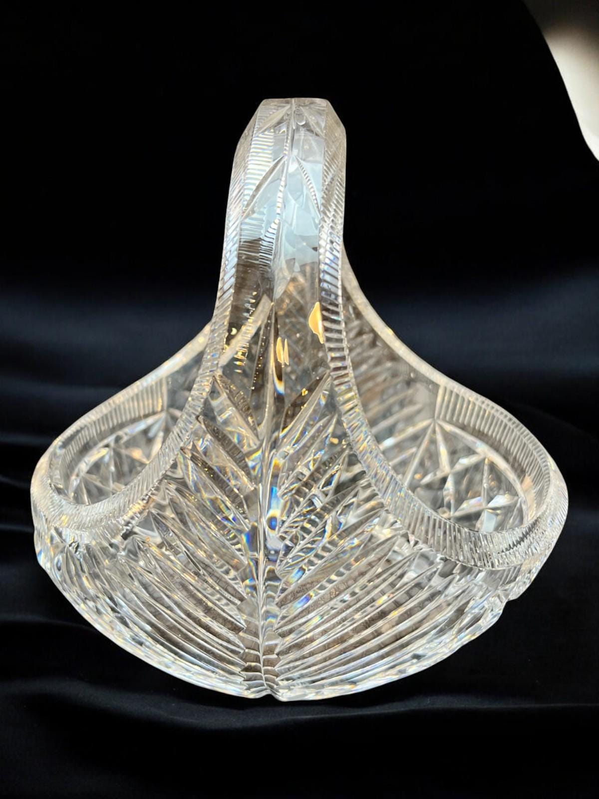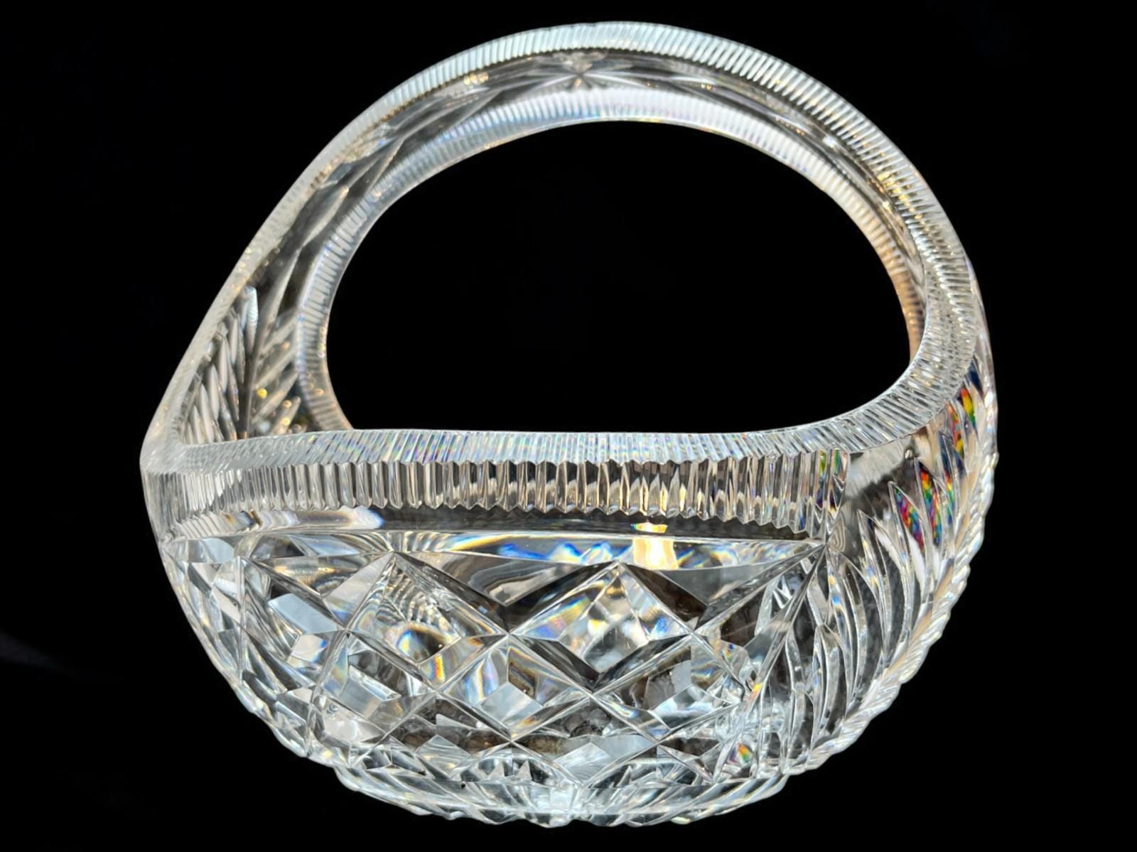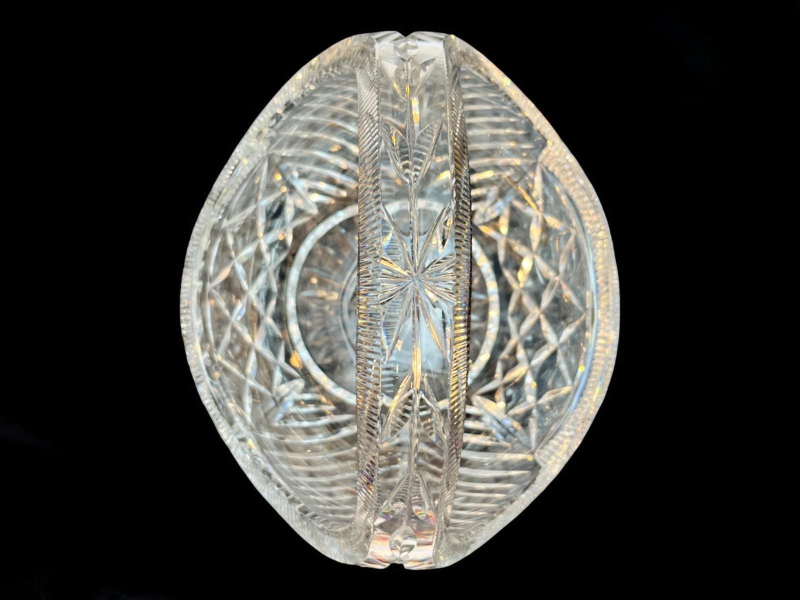 A stunning vintage cut lead crystal basket bowl featuring deep diamond and starburst cuts with a ribbed handle. This elegant piece sparkles beautifully when it catches the light, showcasing the craftsmanship and clarity typical of fine lead crystal.