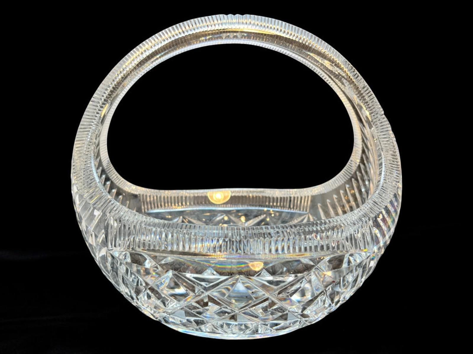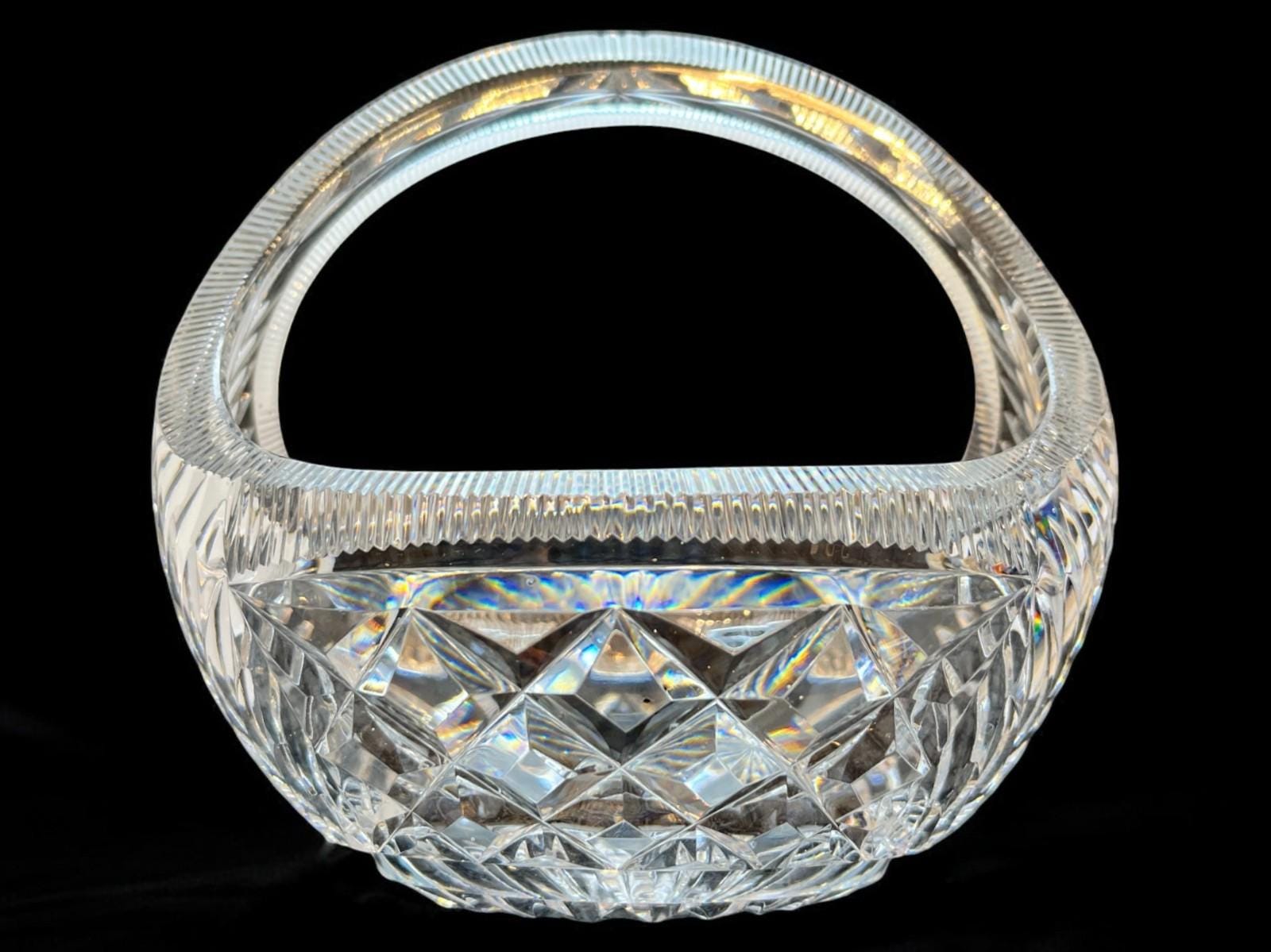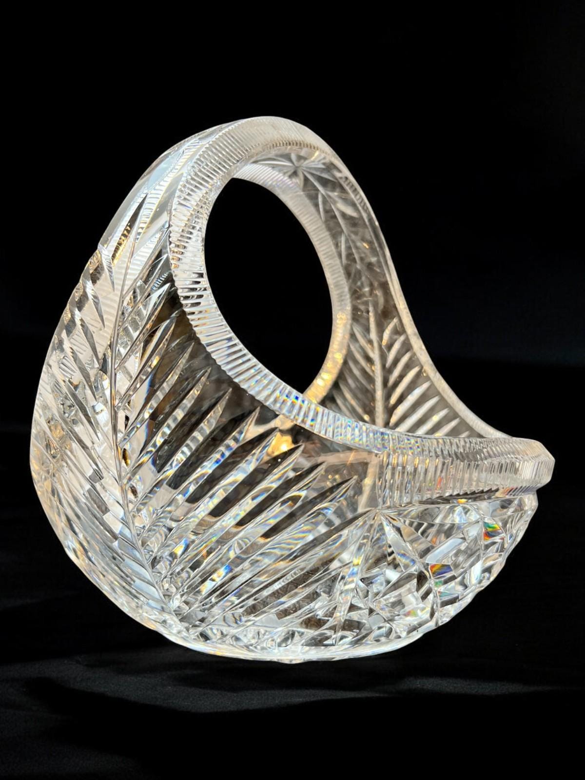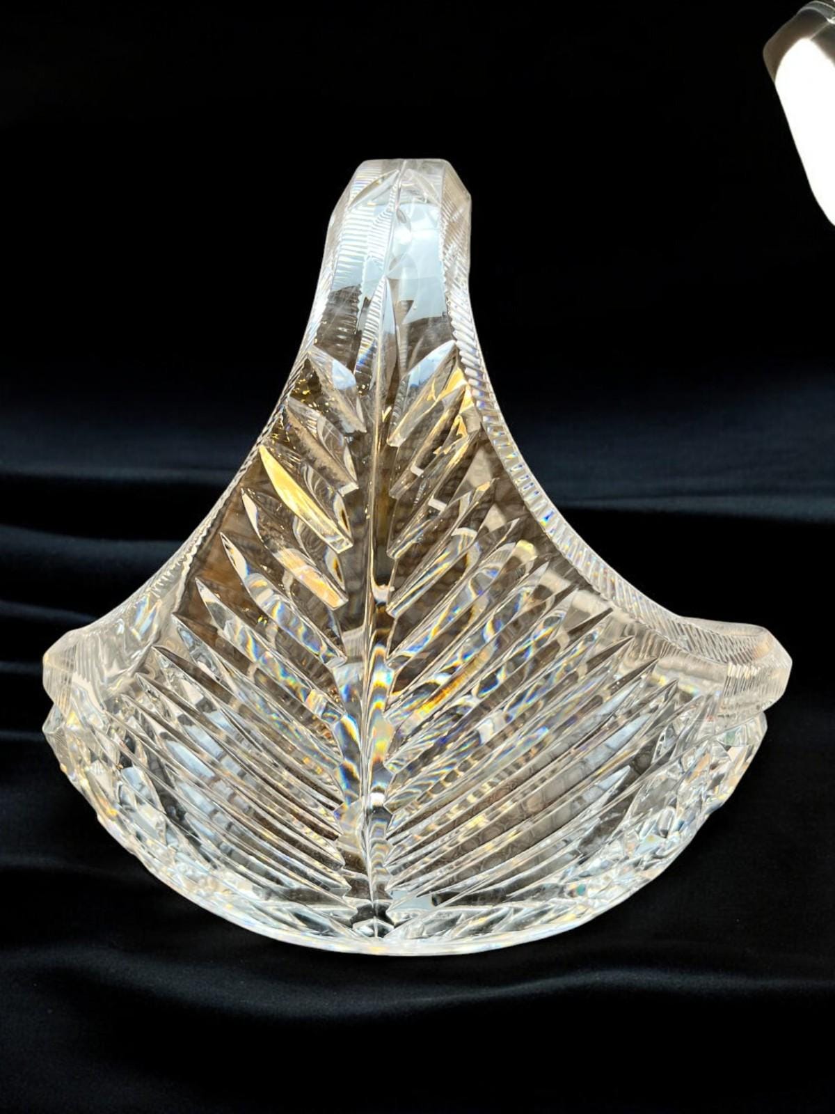 A stunning vintage cut lead crystal basket bowl featuring deep diamond and starburst cuts with a ribbed handle. This elegant piece sparkles beautifully when it catches the light, showcasing the craftsmanship and clarity typical of fine lead crystal.