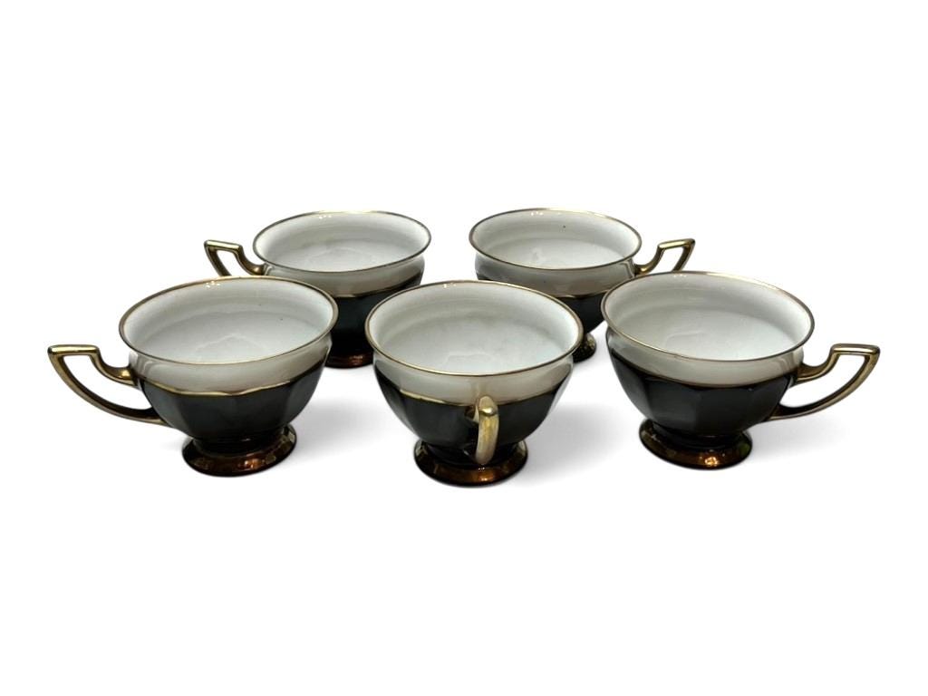 A striking vintage black and gold porcelain coffee set in the Art Deco style, featuring elegant angular handles and faceted forms. The set includes a coffee pot, sugar bowl, and five matching cups — all finished in glossy black with rich gold detailing to the rims, bases, and handles.