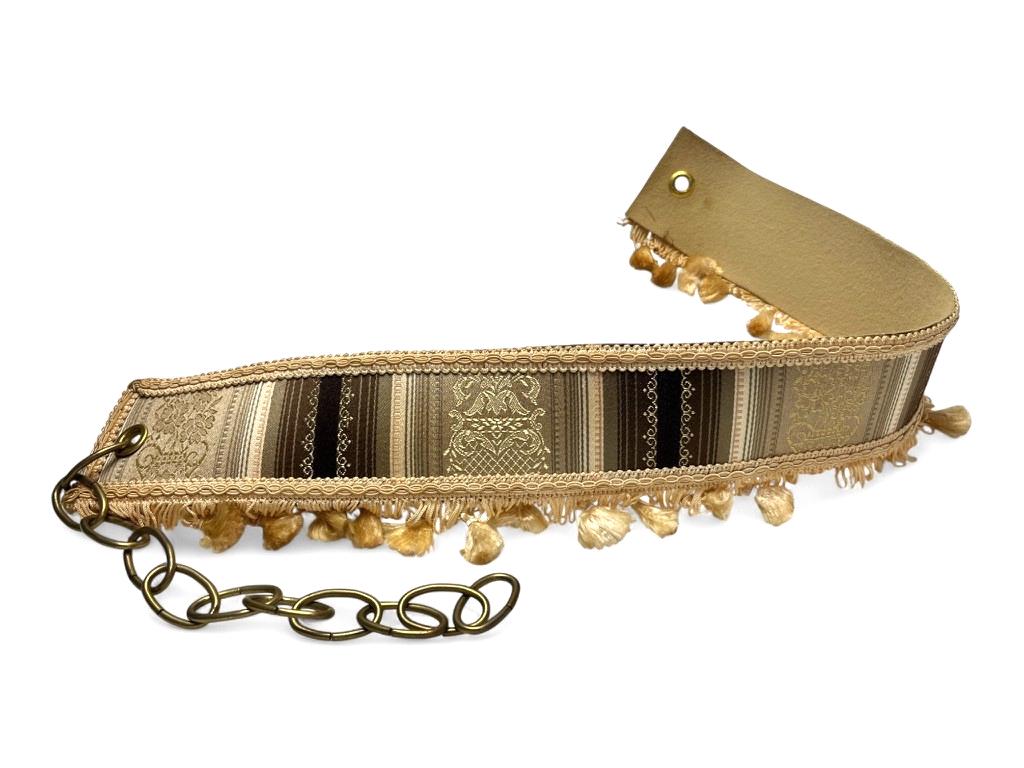 2 pairs of of vintage mid-century curtain tie-backs in a rich gold and brown striped jacquard fabric with a decorative damask motif. The edges are trimmed with gold braid and a soft tassel fringe, finished with brass style metal chains and rings. They are fairly rigid so sit nicely without folding or creasing.