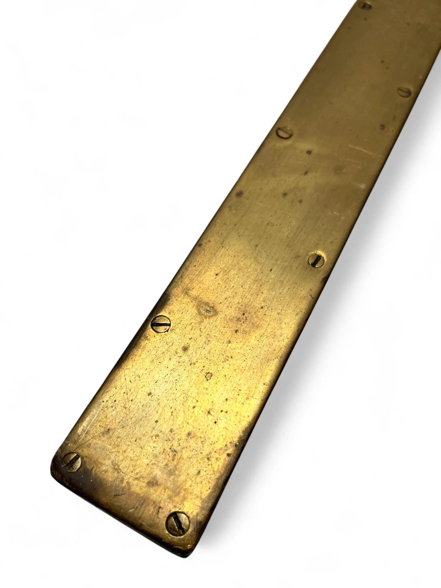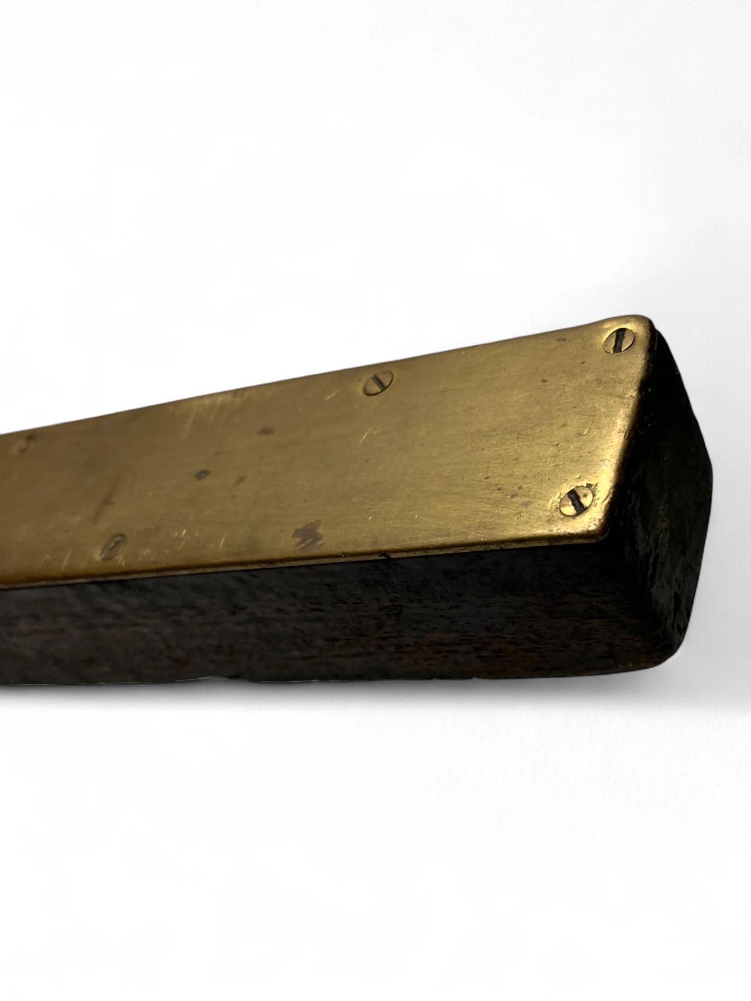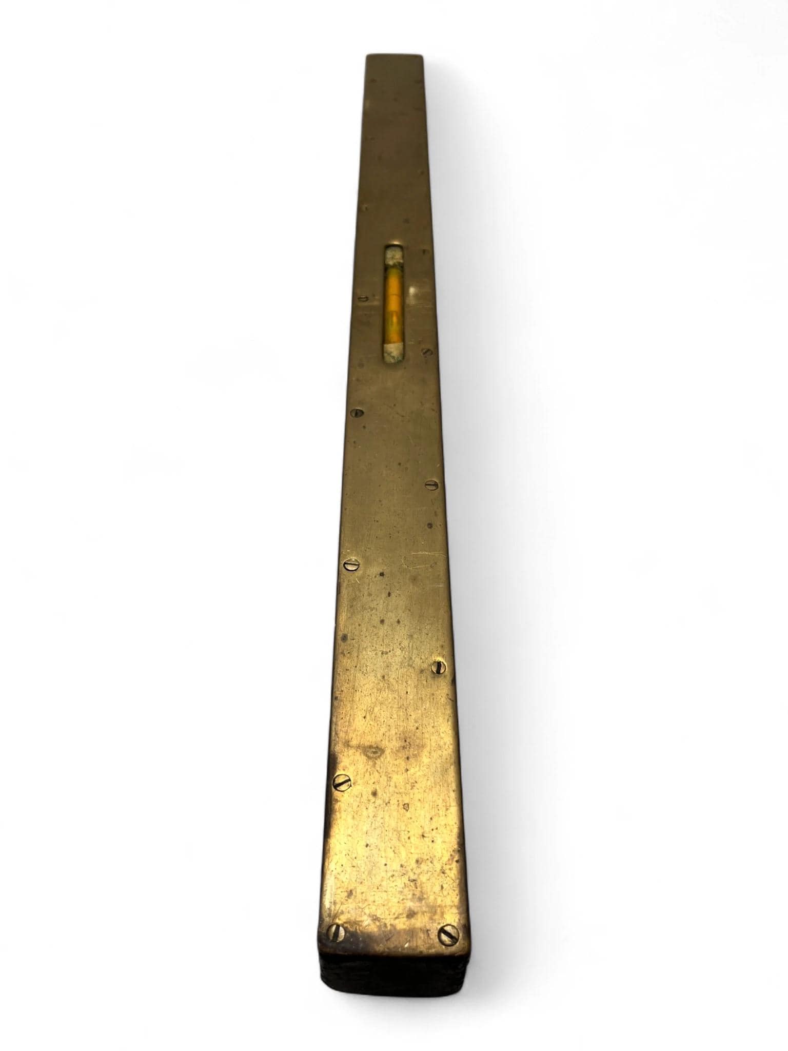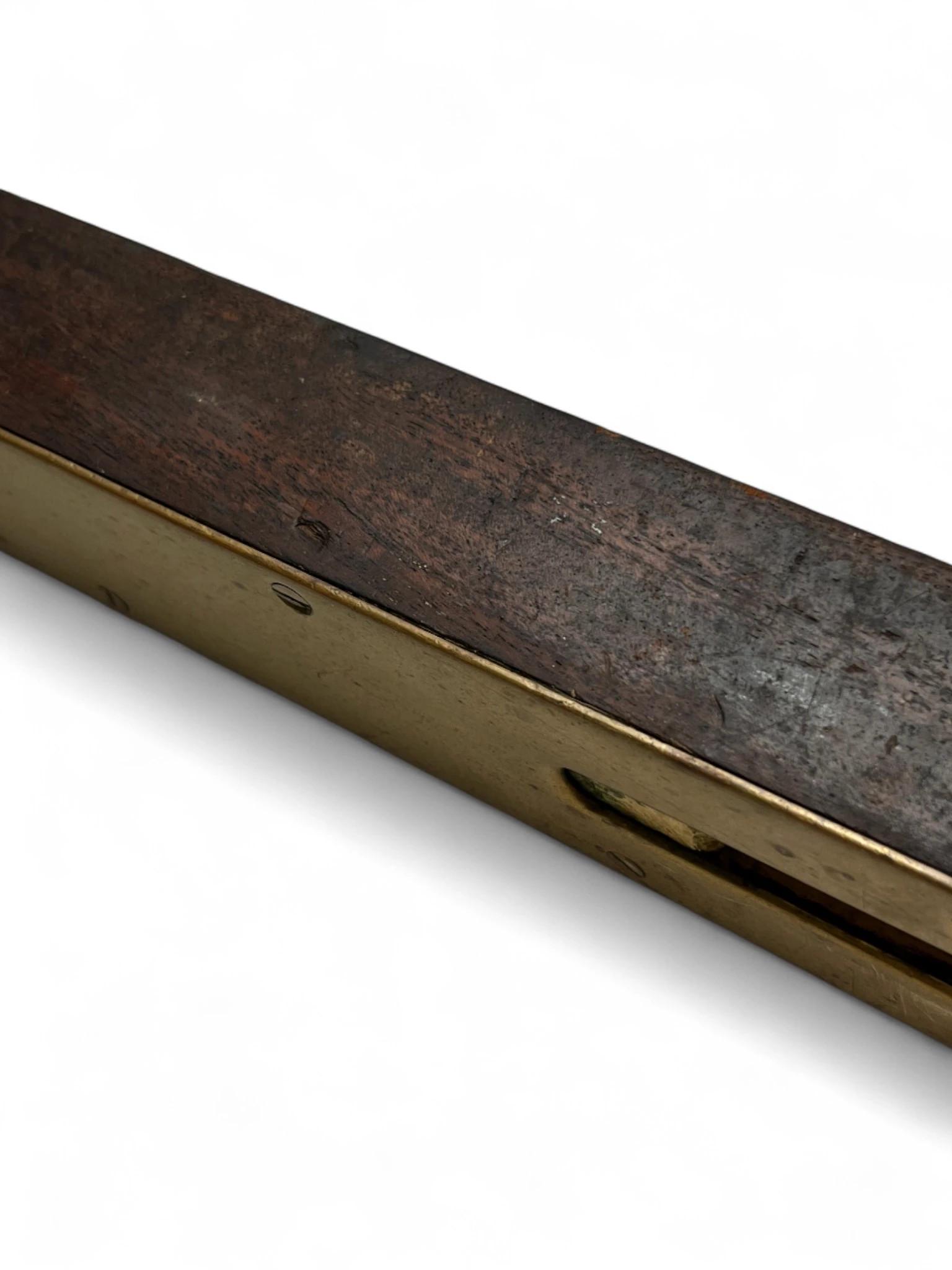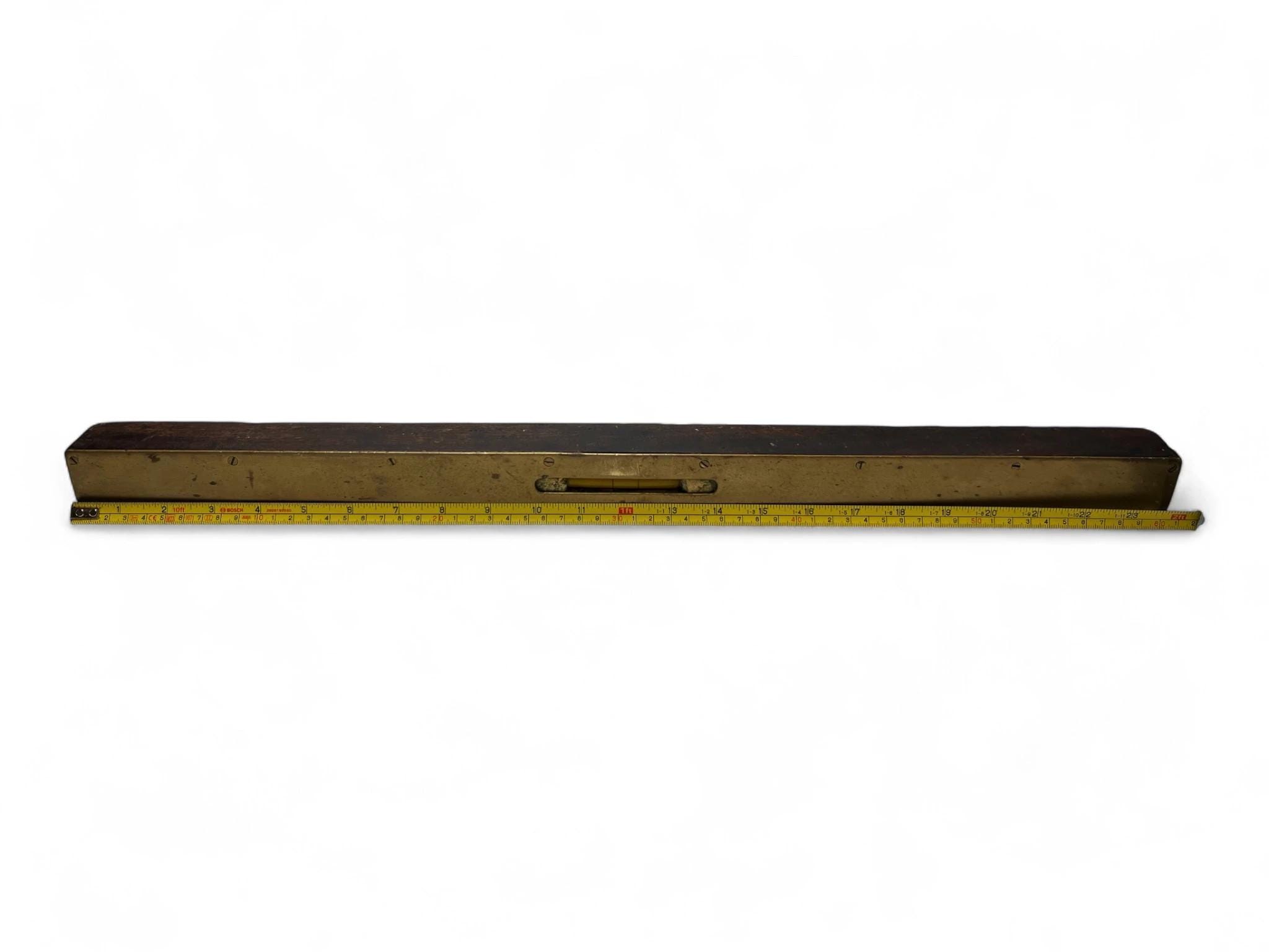 An antique 2ft spirit level featuring a solid brass faceplate and hardwood body, likely dating from the late 19th to early 20th century. This traditional carpenter’s tool has a wonderful aged patina and showcases the craftsmanship of early hand tools.