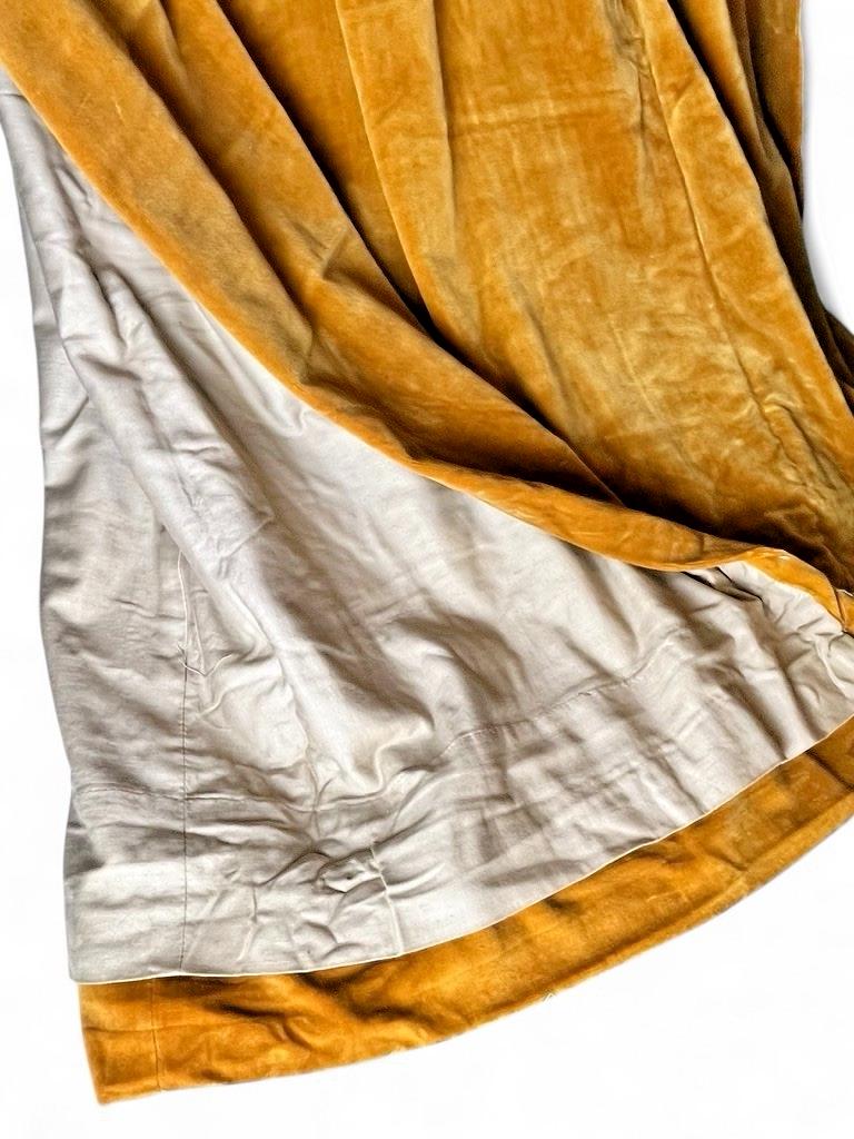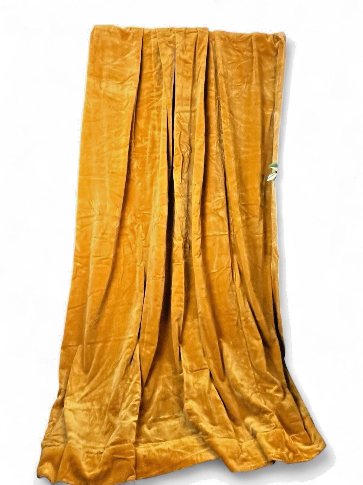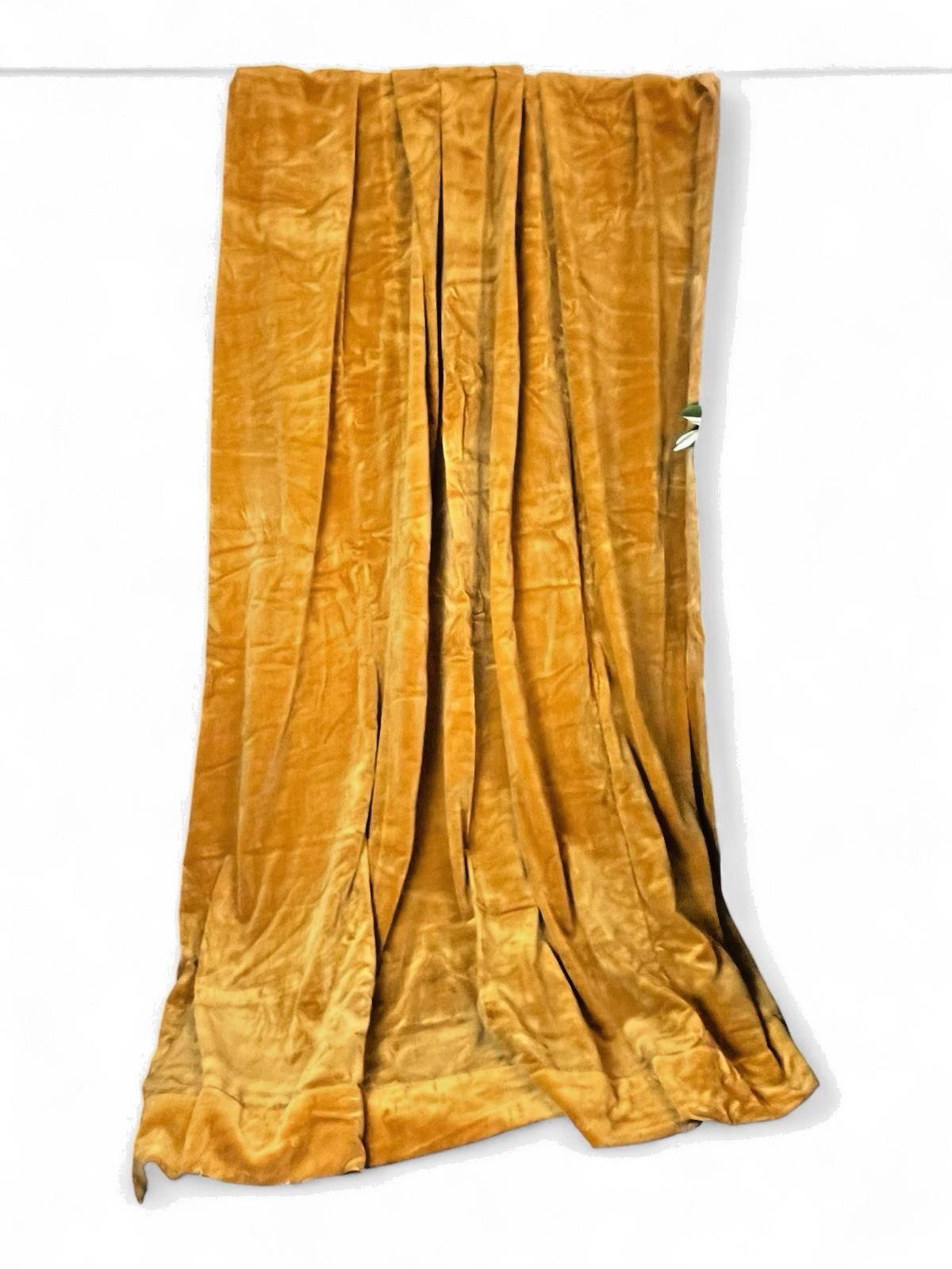 A stunning set of vintage gold velvet curtains in a rich ochre tone with full cotton lining. This large pair of curtains are beautifully made with heavy drape and luxurious mid-century appeal — perfect for period interiors, theatrical decor, or repurposing for upholstery or soft furnishings.