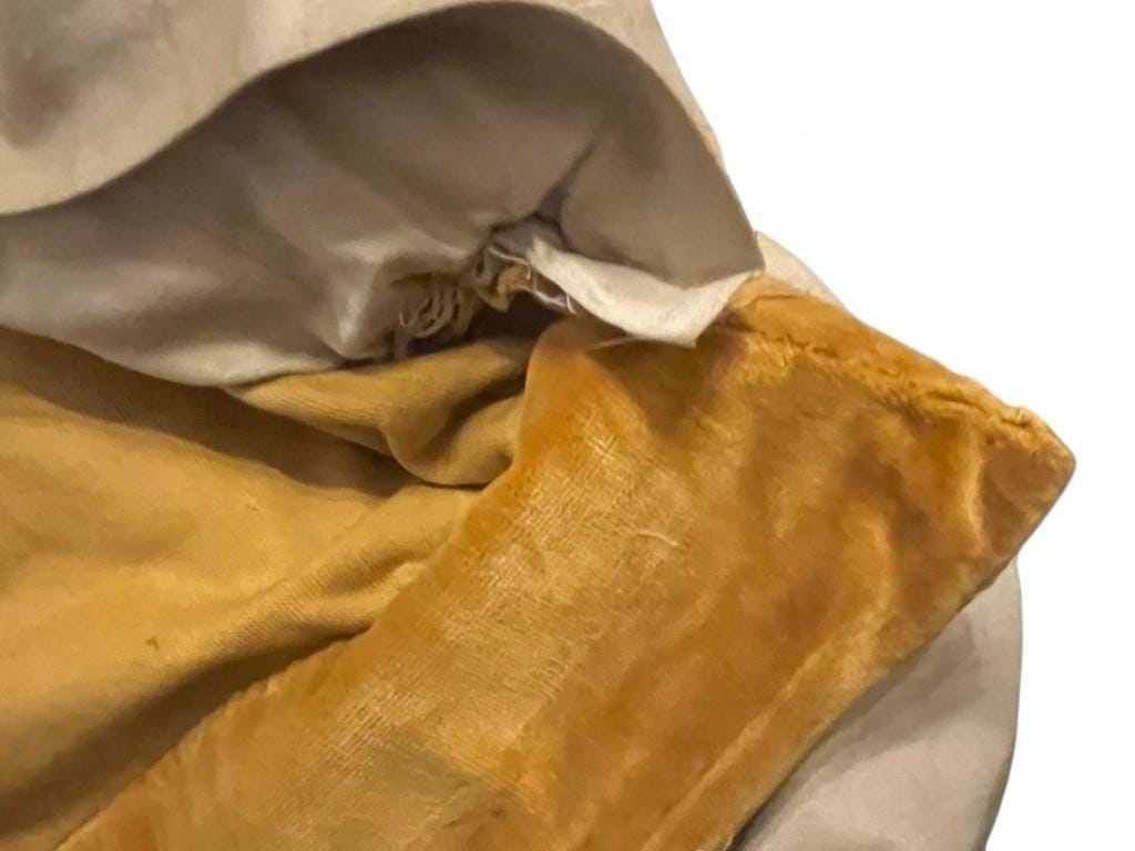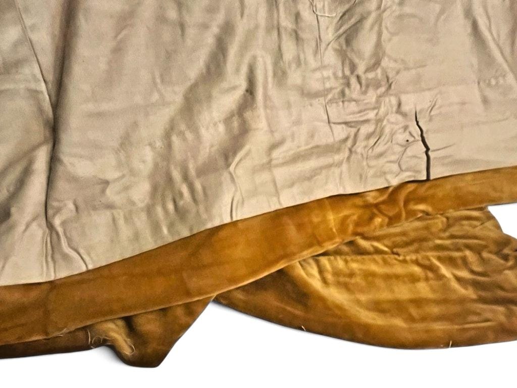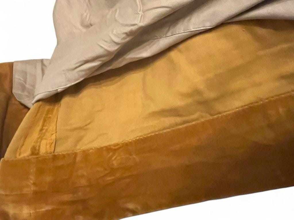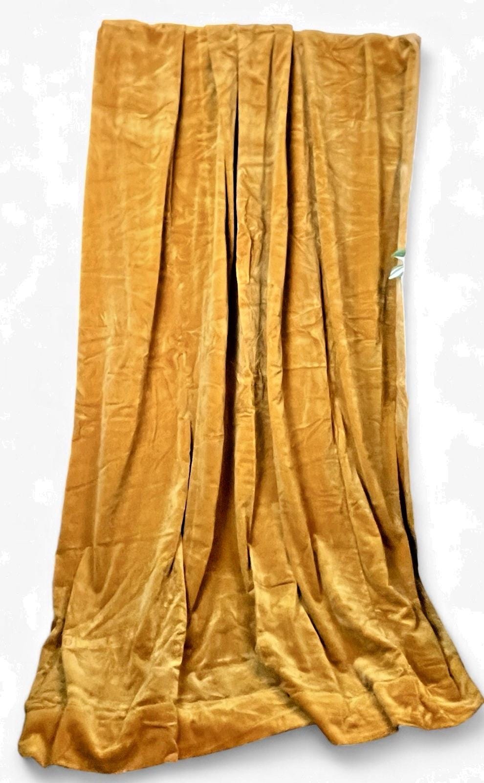 A stunning set of vintage gold velvet curtains in a rich ochre tone with full cotton lining. This large pair of curtains are beautifully made with heavy drape and luxurious mid-century appeal — perfect for period interiors, theatrical decor, or repurposing for upholstery or soft furnishings.